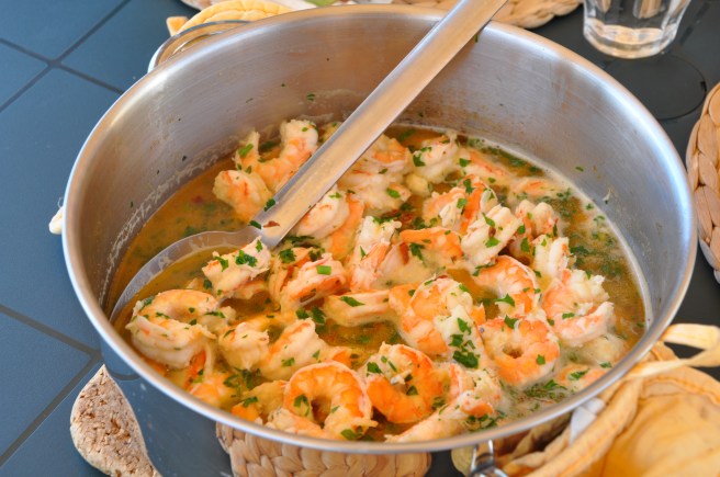 Da vi normalt spiser mindre til frokost hernede (for at have nok plads om aftenen når der bliver tændt op i gårdhavens grill) spiste vi kun baguette til rejerne. Hvis man er lidt mere sulten eller laver retten som hovedret kan det snildt lade sig gøre som spaghetti ret. Jeg ville så undlade vand i retten og i stedet tilsætte 1-2 spsk. af kogevandet fra spaghettien efter samme er blevet vendt sammen med rejerne.