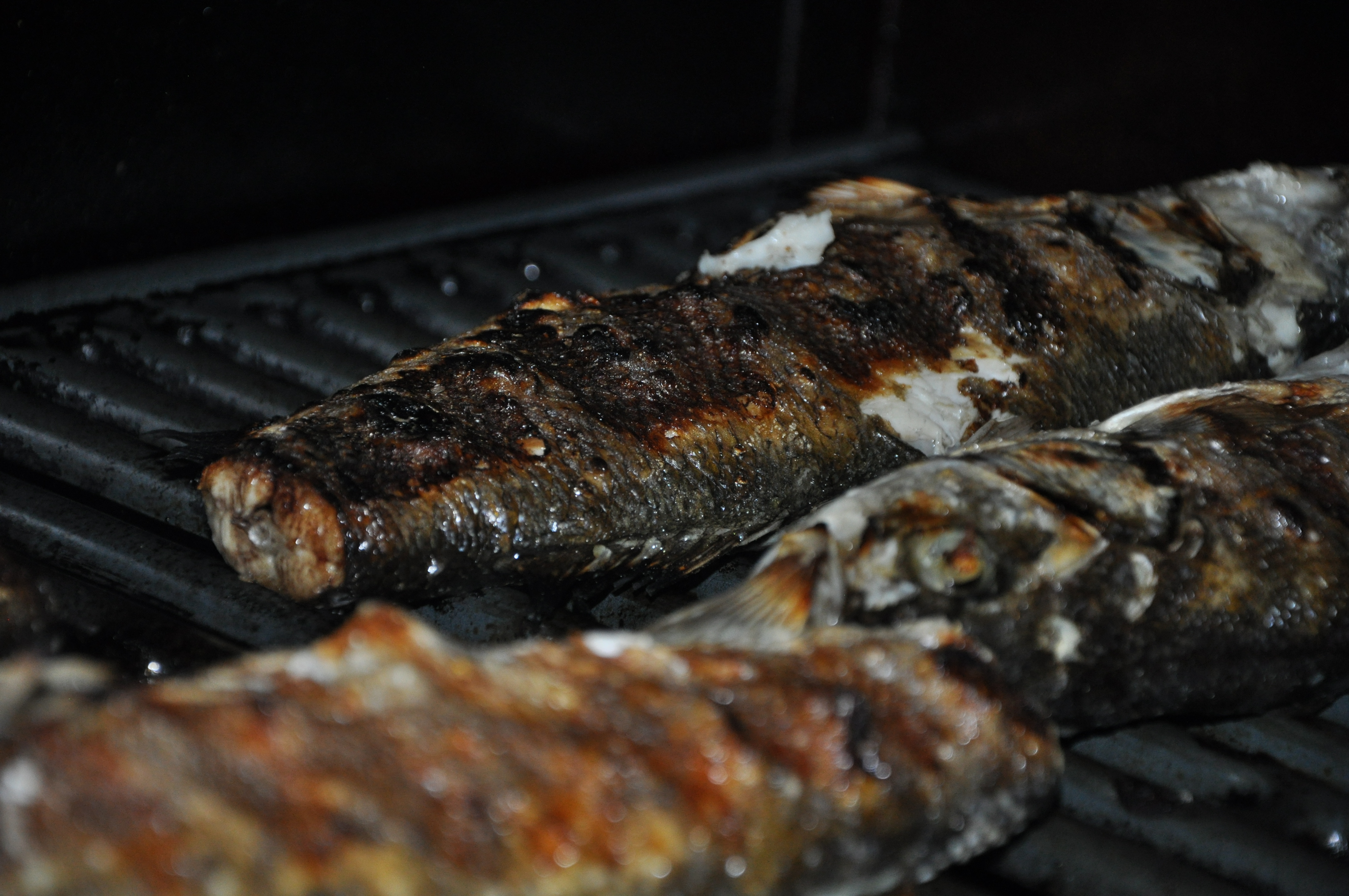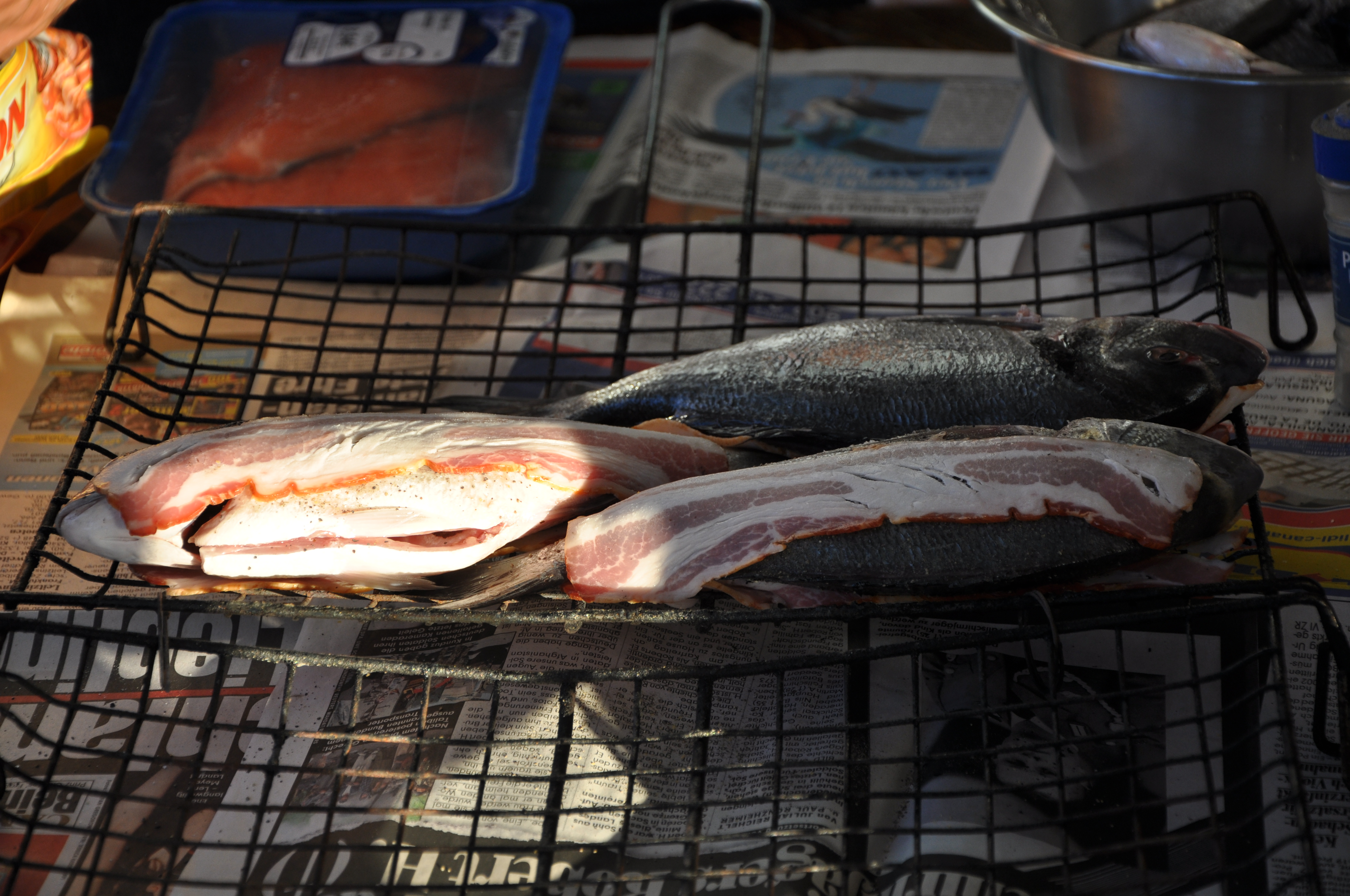 På Tenerife skal den friske fisk bare en tur på grillen og så nydes med kold hvidvin. Et par skiver bacon forhindrer at fisken sidder fast i grill-tangen og det giver dejlig smag til det milde fiskekød mhmmmm….