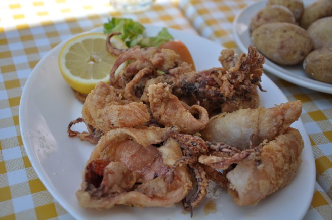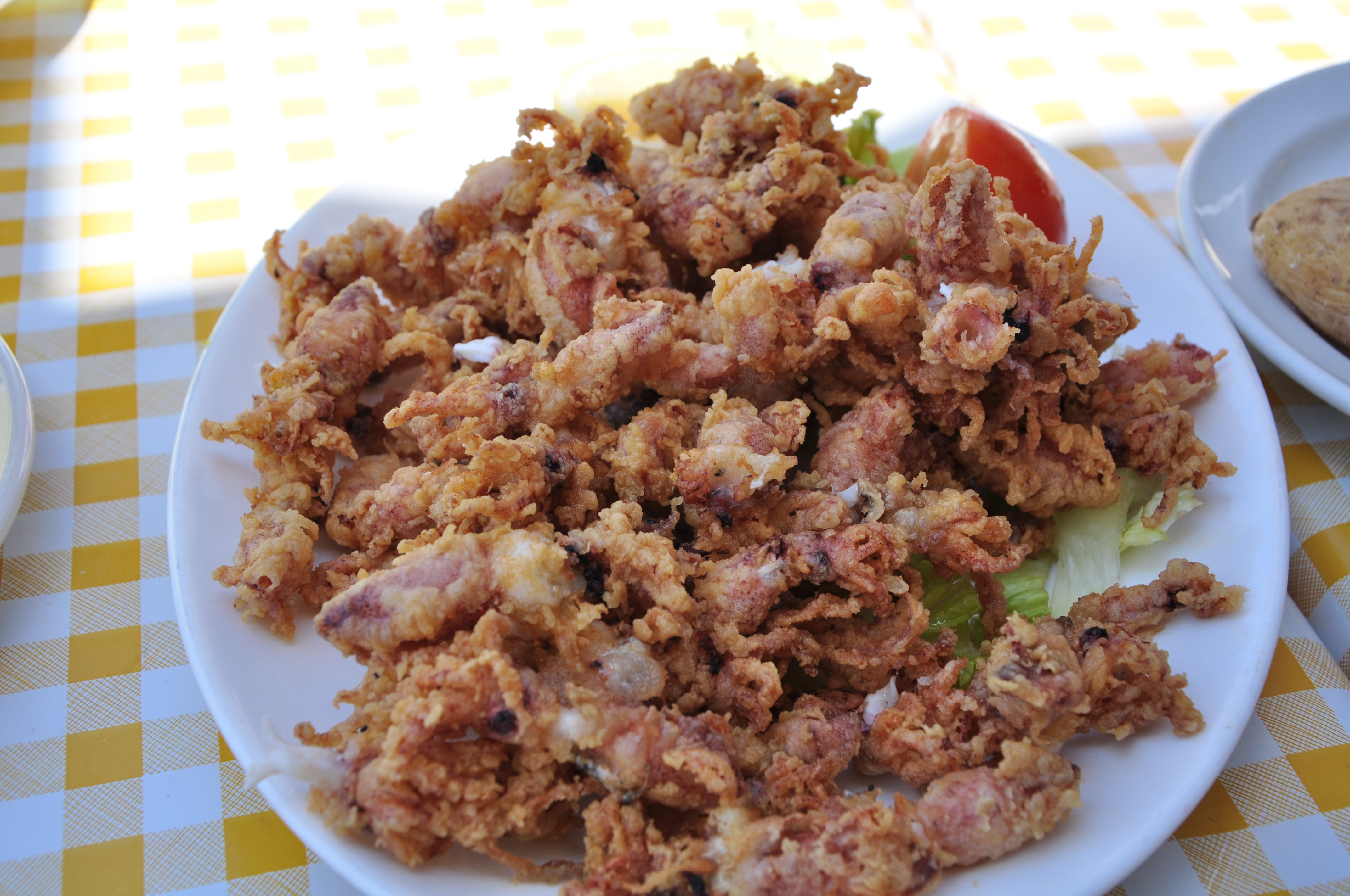 Hvis der skal spises frisk fisk og skaldyr noget andet sted end derhjemme på grillen tager vi gerne ned til vandet til et lille sted som hedder La Caleta. Her er skøn udsigt og vi bestiller altid to slags friteret blæksprutte og paella men de har virkelig alt godt fra havet på menuen..