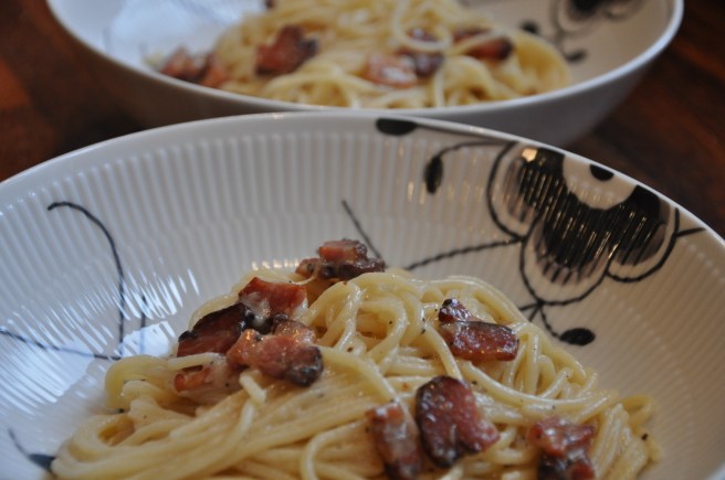 Spaghetti, Pecorino ost, pancetta og friskkværnet sort peber – SÅDAN! Enkelt, super nemt, lækkert –  mere behøver man egentlig ikke.. Måske lige et lækkert glas hvidvin til :-)