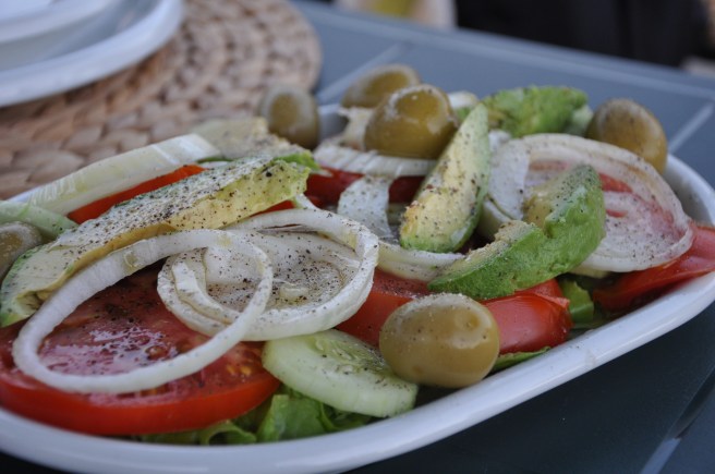 Denne salat blev spist sammen med store lækre kalvekoteletter med hvidløg og rosmarin samt hjemmelavet hvidløgsbrød med en hvidløgssmør lavet på frisk smør, masser af hvidløg samt bredbladet persille.