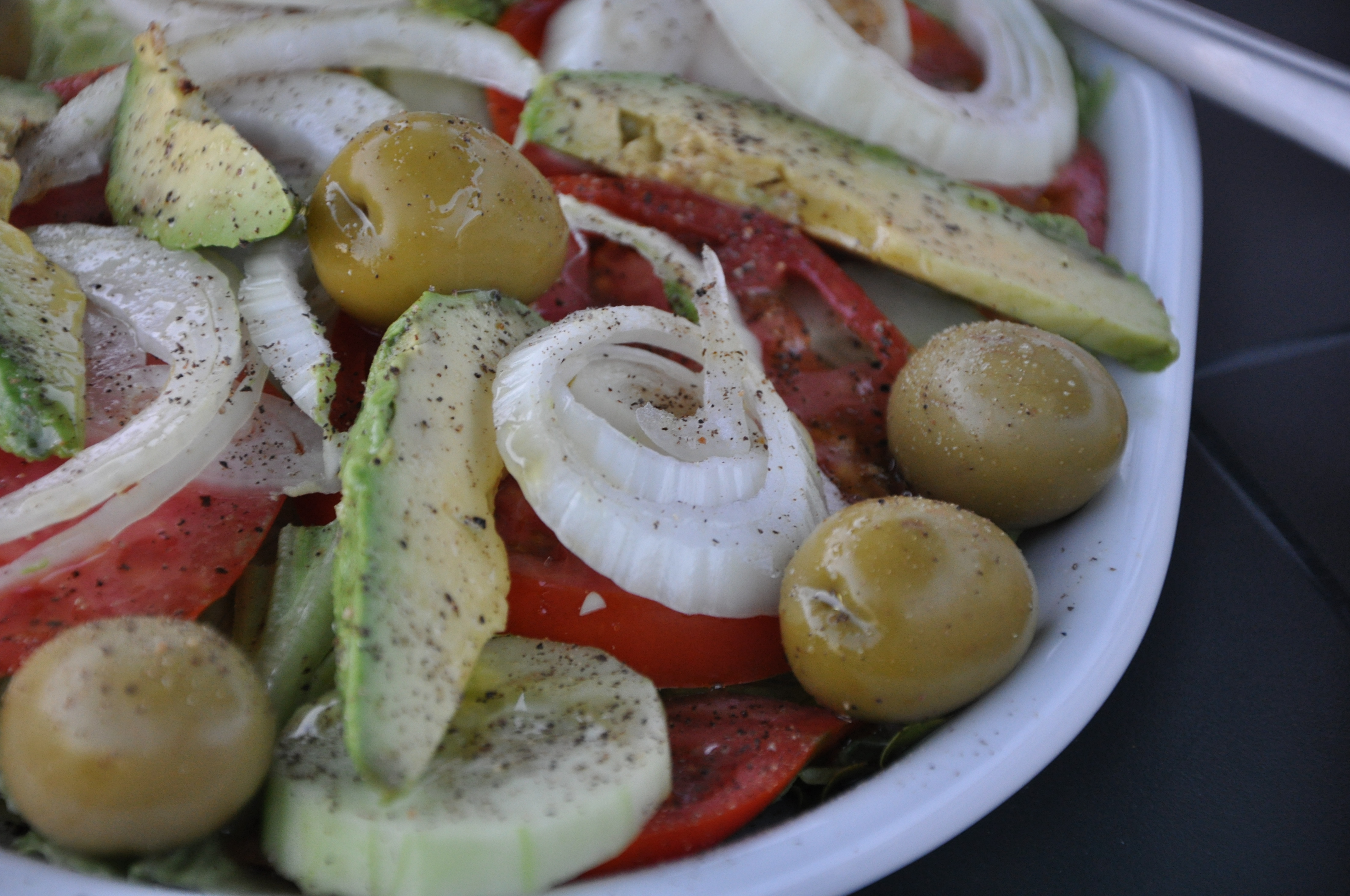 Skær tomaten i skiver og avokadoen i både og læg dem oven på salaten. Skræl agurken og skær den i skiver og skær løgringe af løget og tilsæt dem i salaten sammen med oliven. Hæld en god sjat olivenolie og hvidvindeddike over og krydr med salt og peber – så har du smagen af sommer!