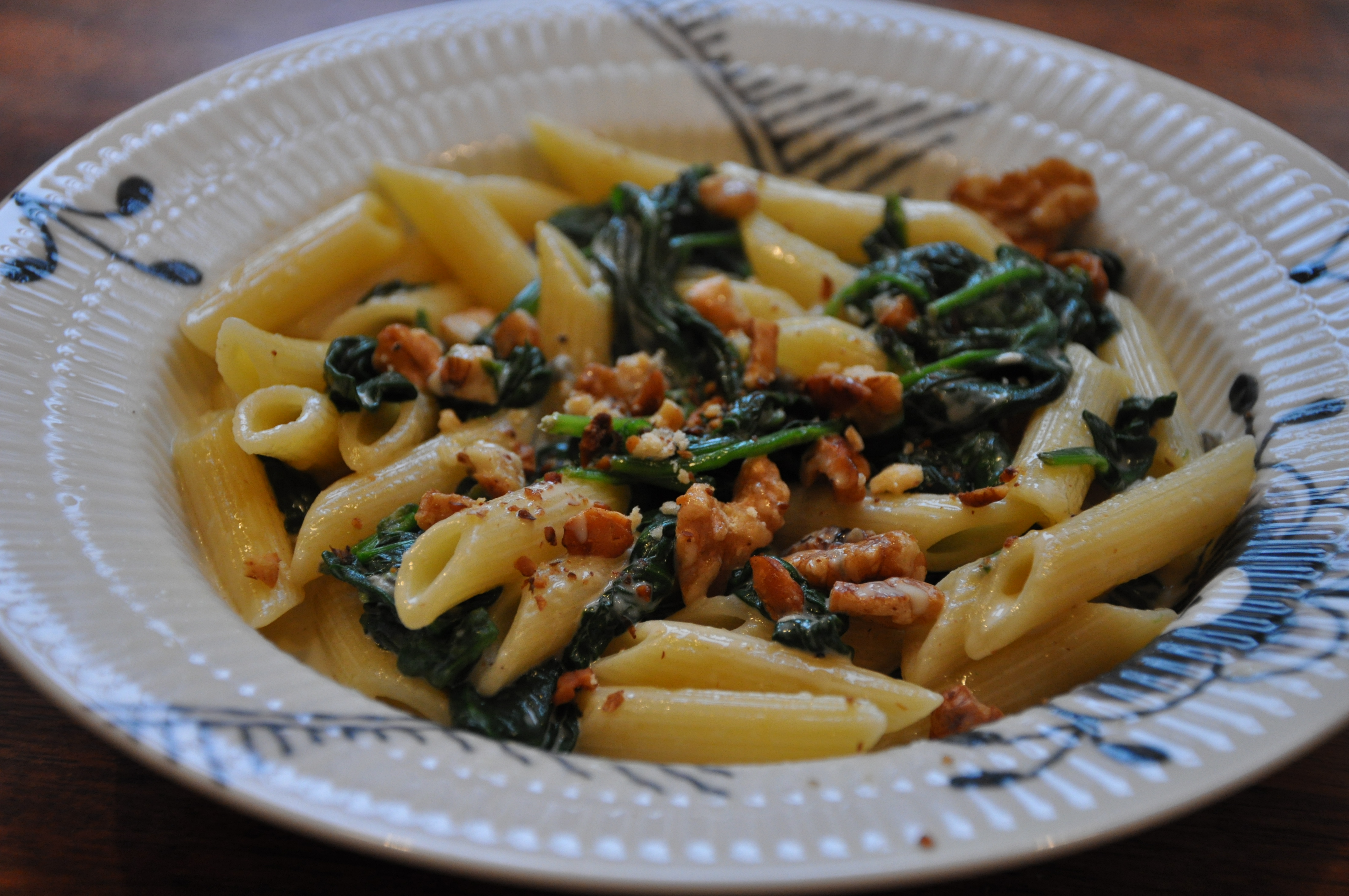 Pasta Penne med gorgonzola, spinat og valnødder – 2 personer.
