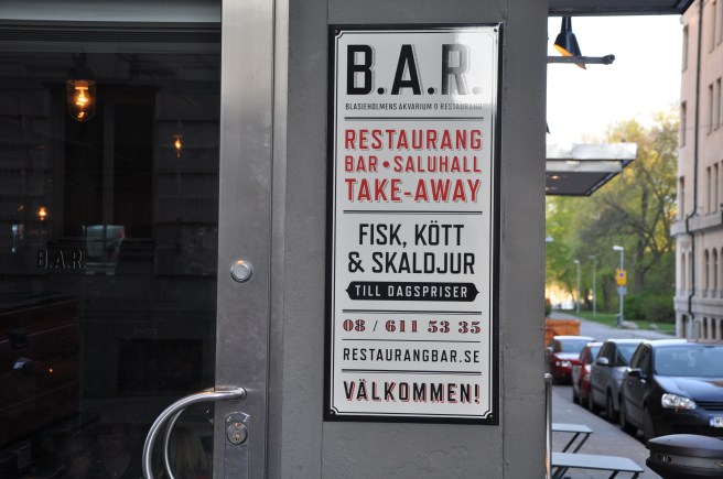 Stedet vi spiste den første aften hedder B.A.R. som står for Blasieholmens Akvarium o Restaurang – Blasieholmen er gaden som restauranten ligger i ikke så langt fra operaen. Lokalet er indrettet råt i fabrik stil med en stor tank med levende hummere og en saluhalle hvor man selv kan vælge sin fisk. Stedets specialitet er skaldyr og fisk men en enkelt steak og gryderet har også sneget sig på menuen.