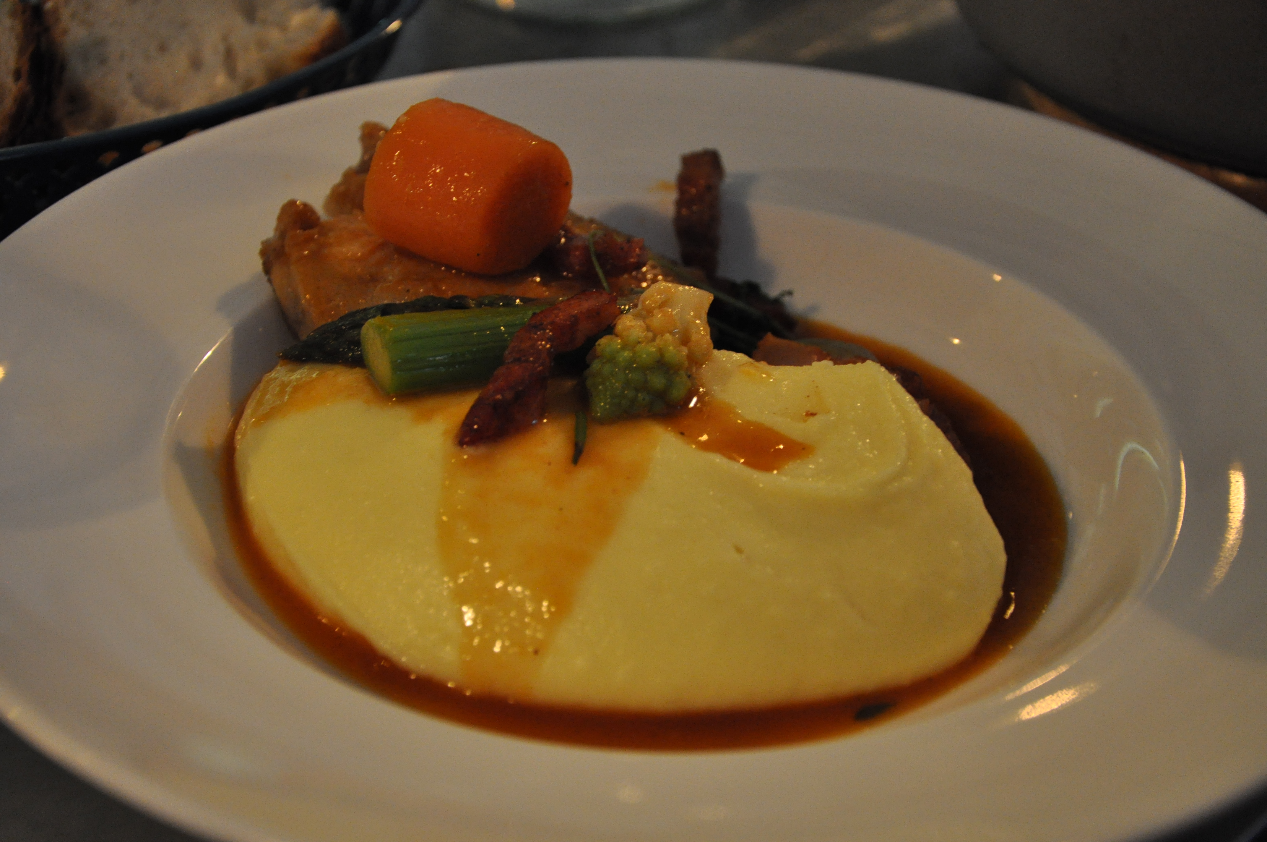 Til hovedret besluttede Sebastian sig for at gå efter fisken og bestilte en gang fish n’ chips som blev serveret traditionelt med eddike på fritterne. Jeg besluttede mig for kyllingen i cocotte som blev serveret med kartoffel/mandel mos – uhaa hvor det smagte.
