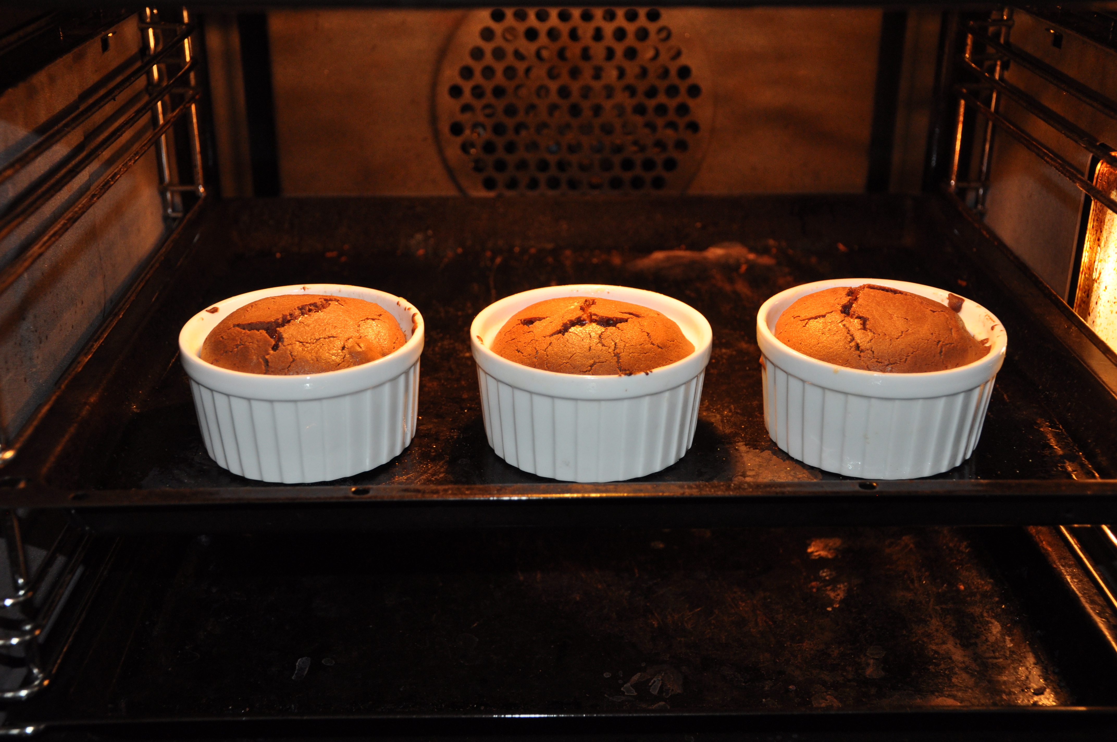 Kagerne skal laves lige inden de spises. Tænd oven på 200 grader og smør de ildfaste forme med lidt smør og drys med lidt mel. Kom dejen i formene (dejen er meget fast på det her tidspunkt), og bag dem i ovnen 10-12 minutter. Lav eventuelt en stikprøve på en af kagerne inden du tager dem ud. Kagerne skal være flydende i midten, men være faste rundt i kanten (ca. 1 cm ind). Tag kagerne ud af ovnen og vend dem ud på en tallerken. Hvis de absolut ikke vil komme ud, kan de eventuelt spises med en ske direkte fra skålen.