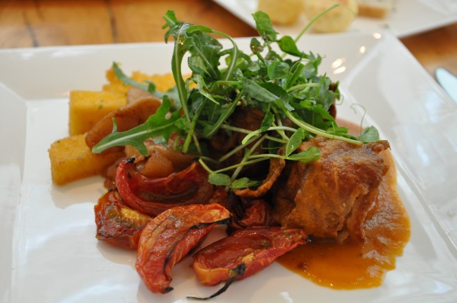 Til forret fik vi henholdsvis andesalat med watergrass og rejer i karry med ananas og jordbær. Til hovedret fik vi wild pork med stegt polenta og en lækker sauce. Som en lille side dish havde vi bestilt små cheese bread. Det hele smagte fantastisk og det kan virkelig anbefales hvis man er i Beijing. Value for money$$
