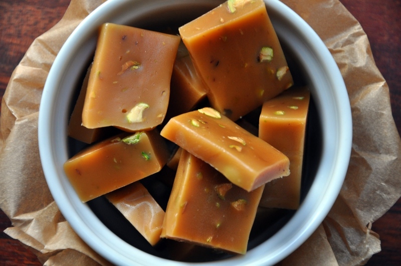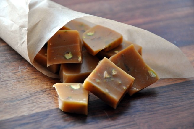 Start med at smelte smør, kondenseret mælk, honning og rørsukker ved svag varme mens du rører konstant med et piskeris så det ikke brænder på. Når blandingen er smeltet sammen og sukkeret er næsten opløst skrues der op for varmen og piskes godt i cirka 10 minutter til massen har fået karamelfarve og er begyndt at tykne. Tilsæt de hakkede pistacienødder og rør rundt en sidste gang.