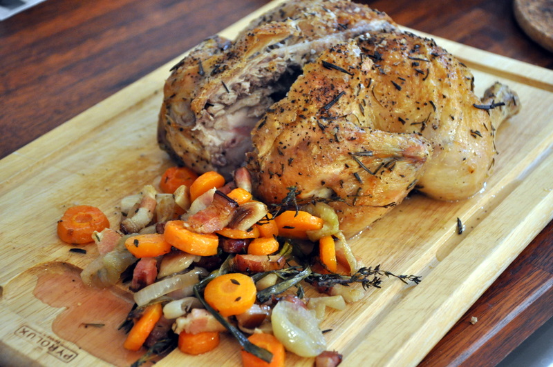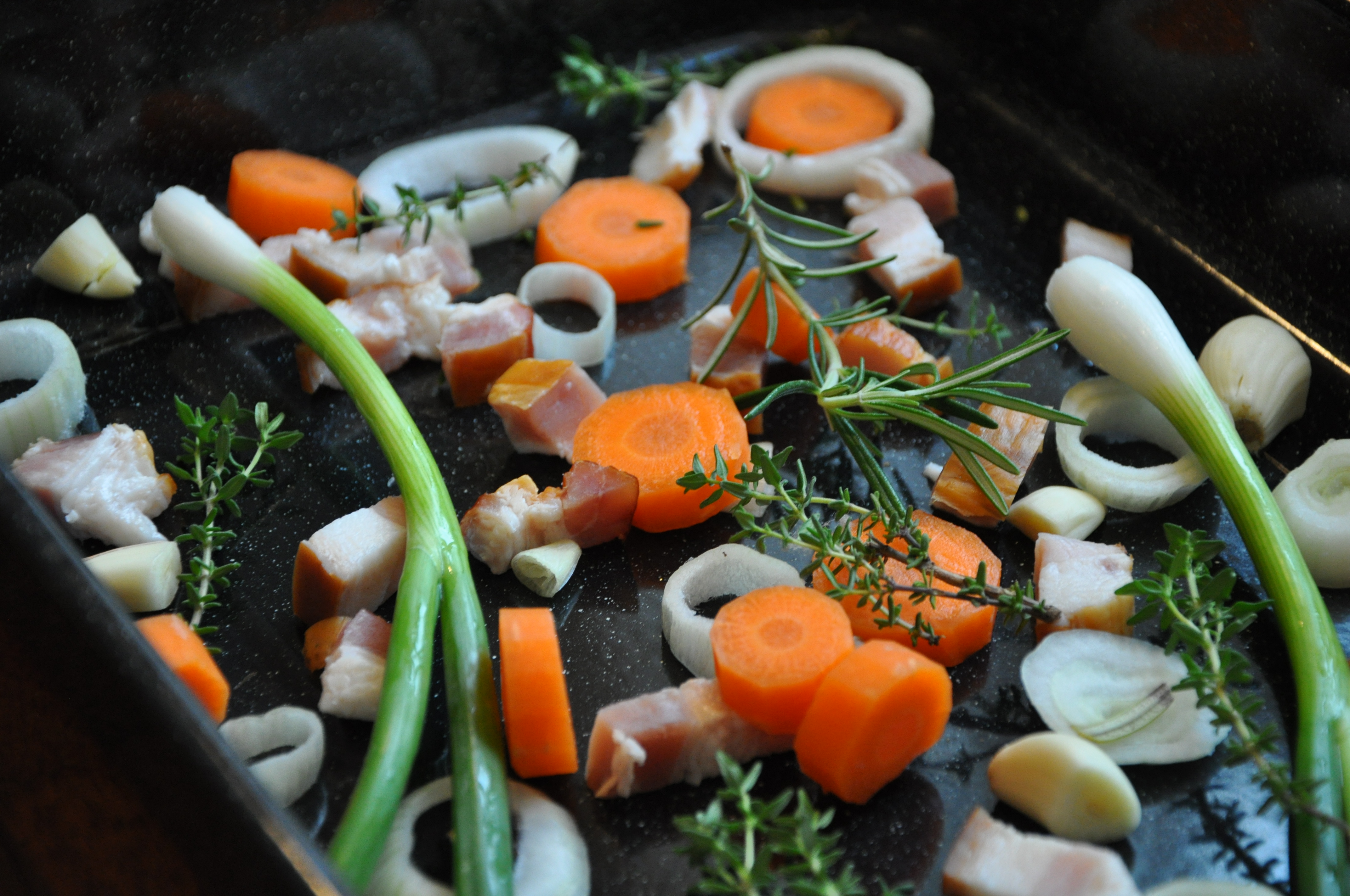 Kyllingen var lige ud af landevejen. En håndfuld pancetta, friske forårsløg (hele og i skiver), et par gulerødder i skiver, 3 hvidløg samt frisk timian og rosmarin blev anrettet i en ovnfast fad og tilsat en anelse hvidvin og vand. Kyllingen blev penslet med lidt olivenolie og krydret med salt og peber hvorefter den blev lagt på en rist oven på grøntsagerne og så i ovnen (200 grader) i en time.. Altid et hit!