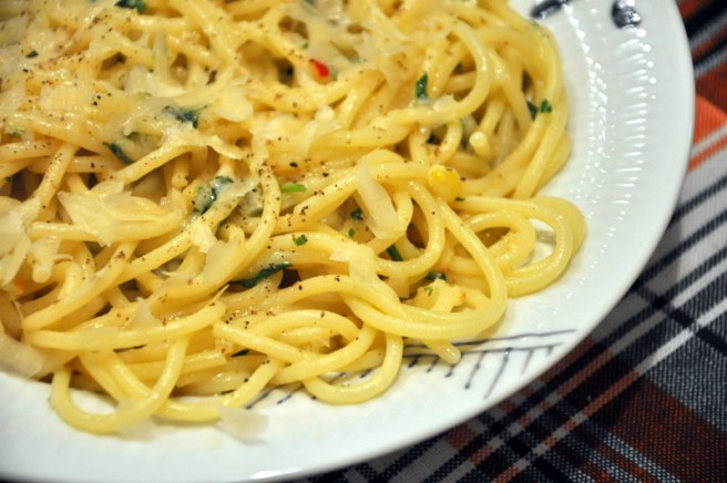 Jeg er alene hjemme i aften og fik lyst til at lave en enkelt spaghetti ret med chili, hvidløg, citron og persille da jeg allerede havde alle ingredienserne i køleskabet.
