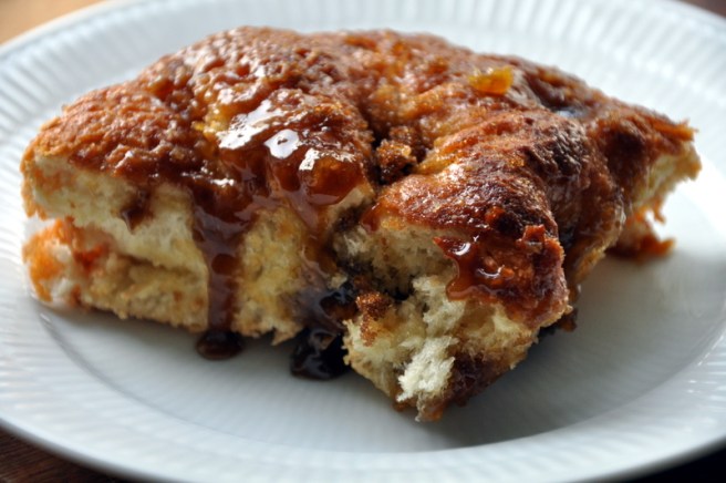 I mellemtiden laves toppingen. Det gøres ved at koge alle ingredienserne sammen hvorefter blandingen hældes over dejen som nu skal hæve/stå i endnu en time og sætte sig.
