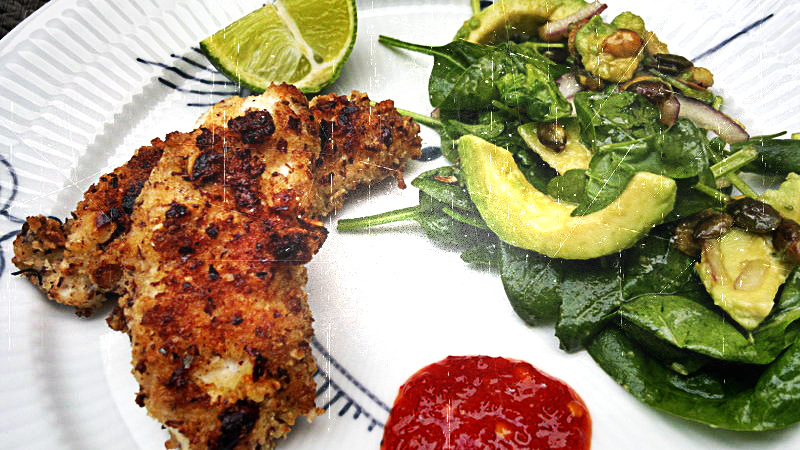 En skøn sommerret med crunchy kylling og spinatsalat. Opskriften kommer fra et gammel Femina fra 2010.