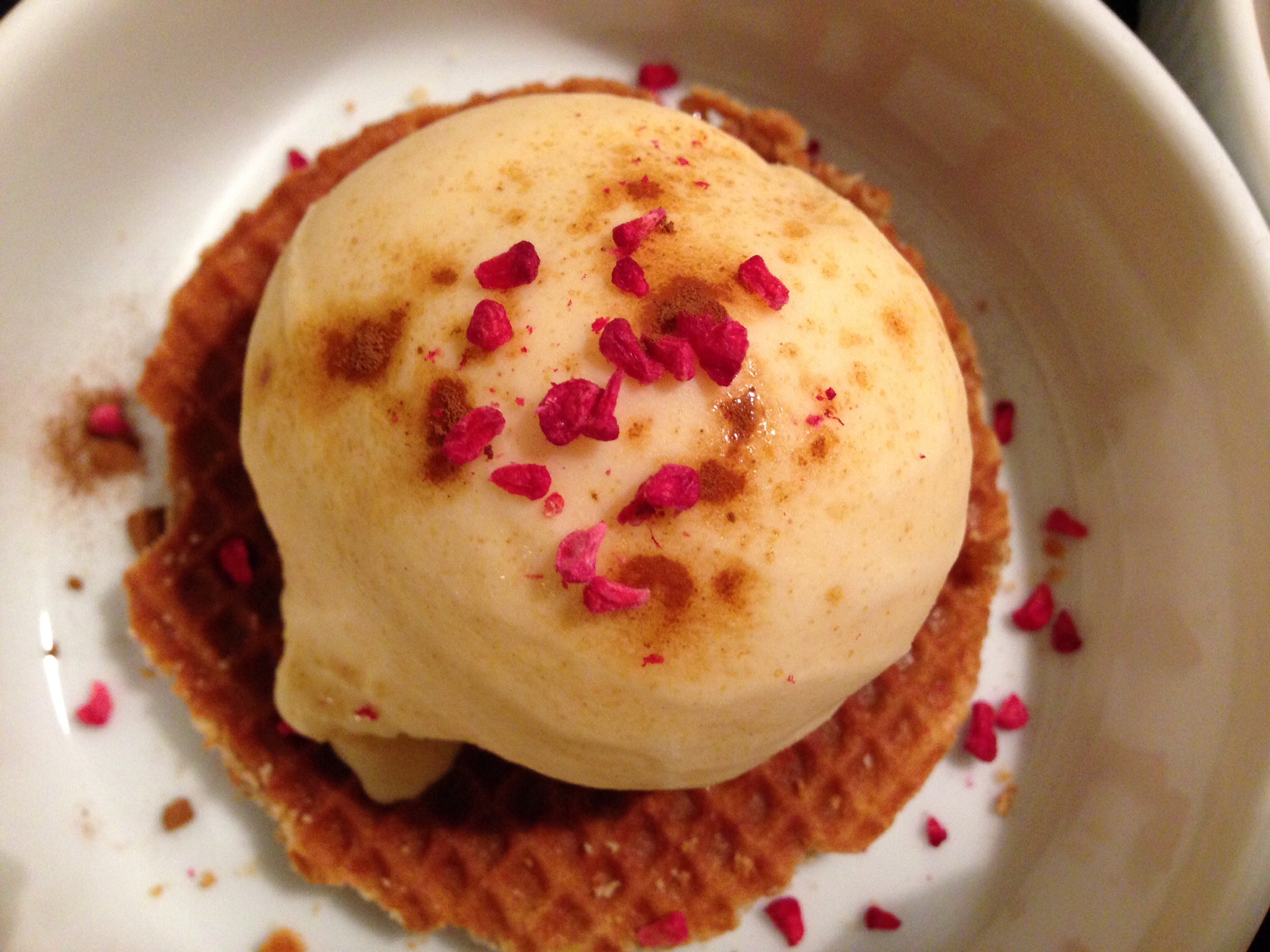 Efter en 6-8 timer er isen klar, blød og lækker direkte fra fryseren. Pyntet med rålakrids, det er gode sager og det bliver ikke nemmere at lave is.