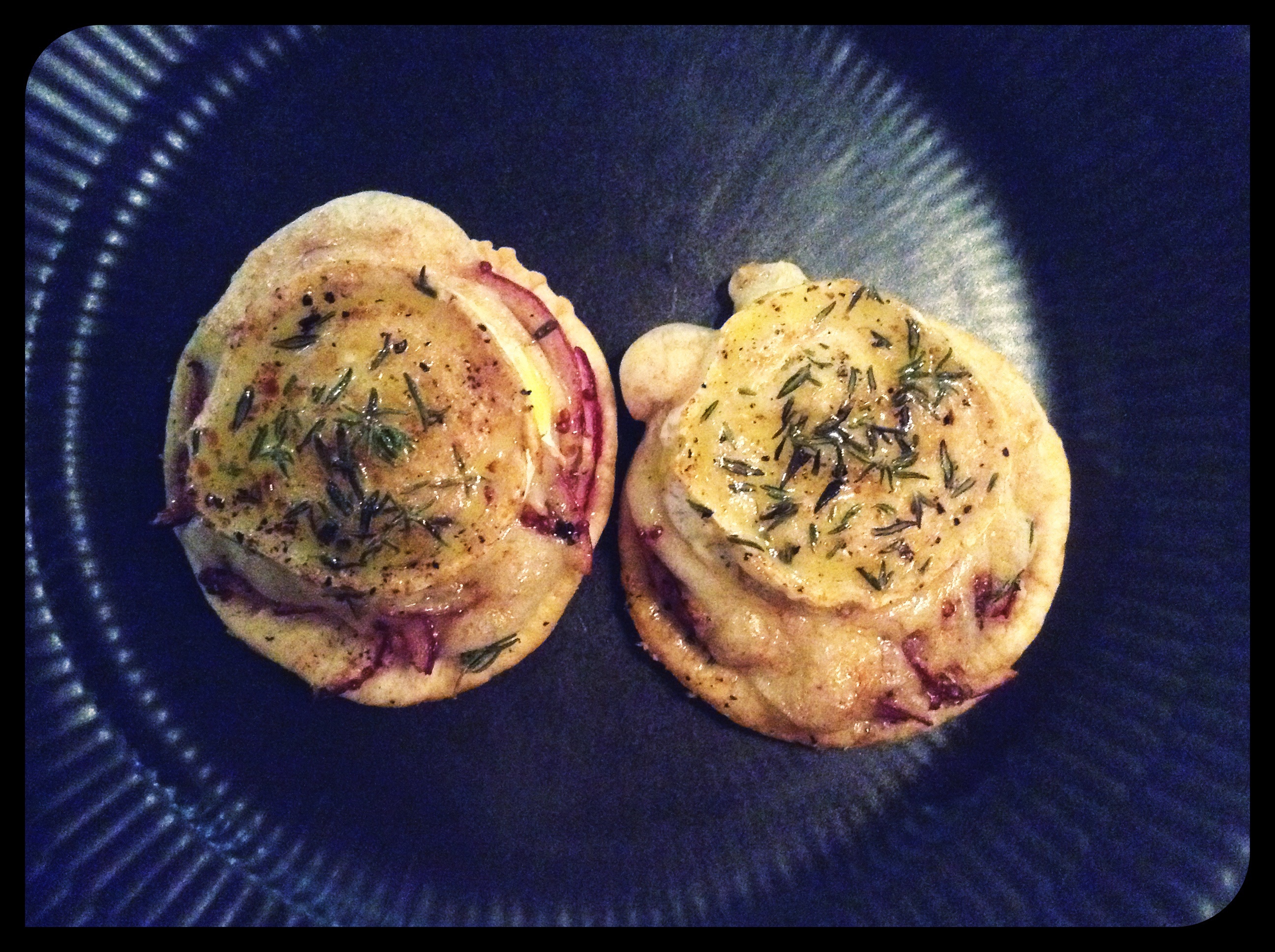 Skær rødløget i tynde halve løgringe og vend dem med sennep og en smule olivenolie. Anret løgene på dejcirklerne. Skær 6 tykke skiver gedeost og læg dem oven på løgene. Krydr med salt og peber og frisk timian.