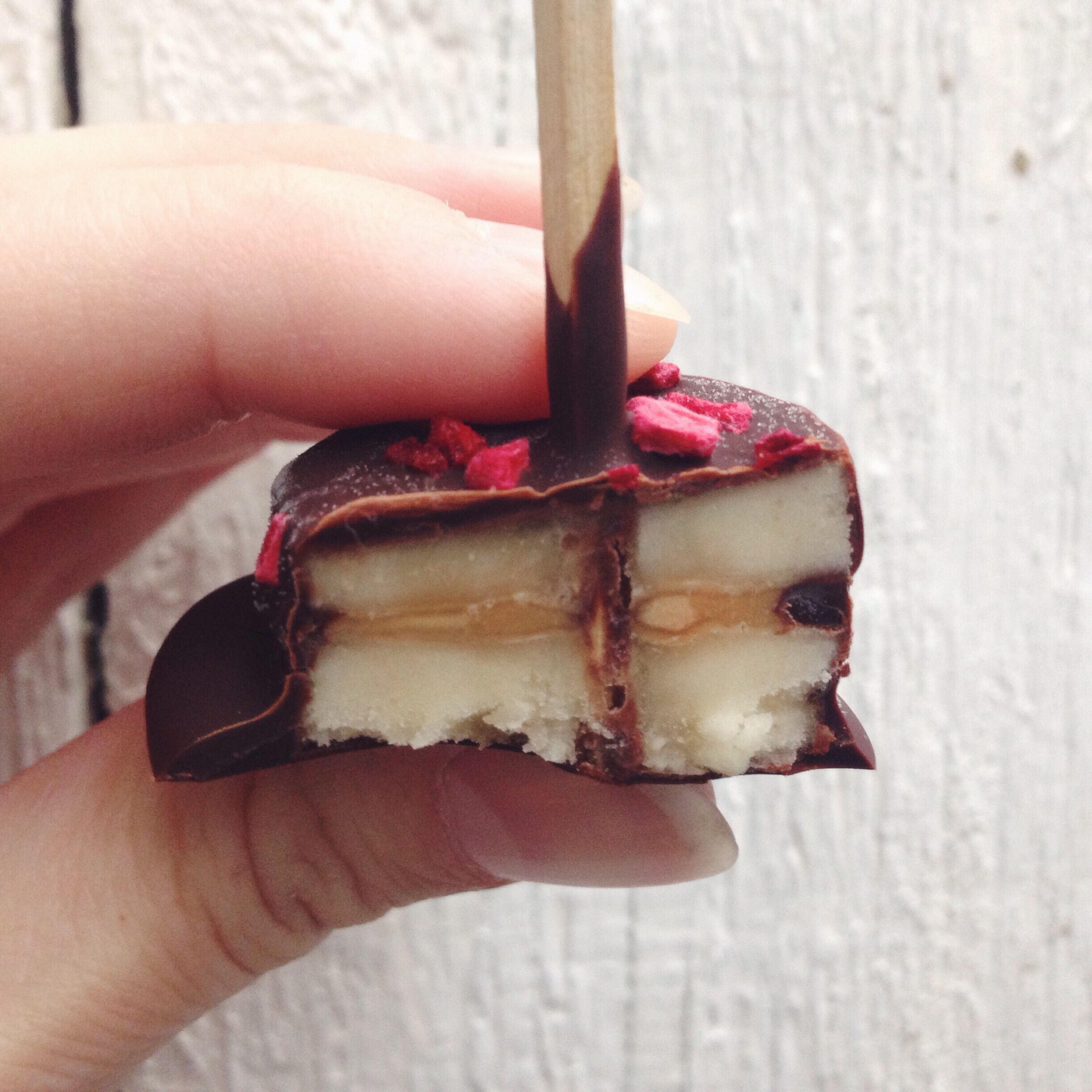 - Drys med knas eller nødder. Her brugte jeg hakket mandler, havsalt og frysetørret hindbær.