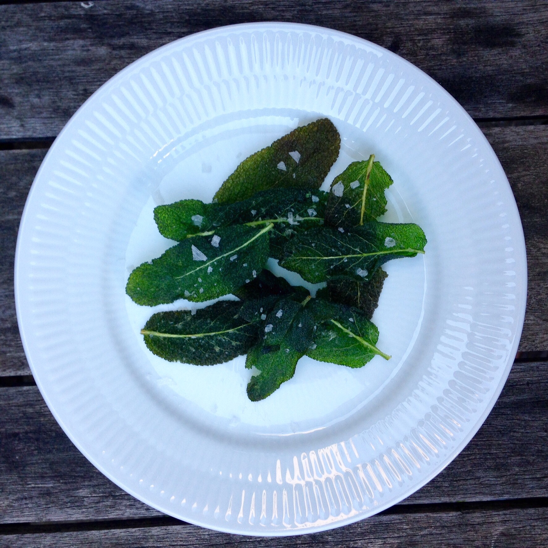 Det her er måske verdens nemmeste snacks. De små salvie chips tager 2 minutter at lave og så er de bare super skønne til et glas vin.
