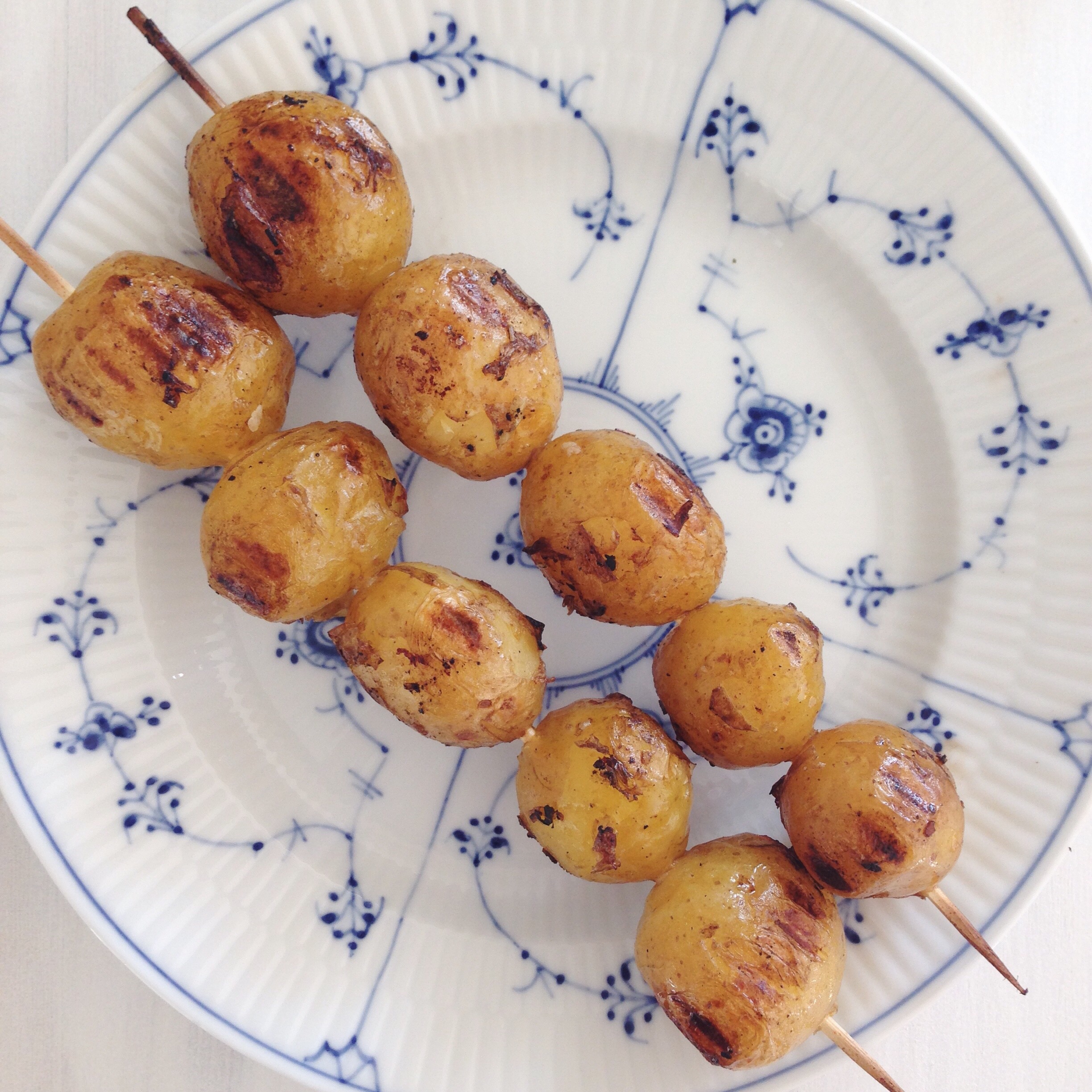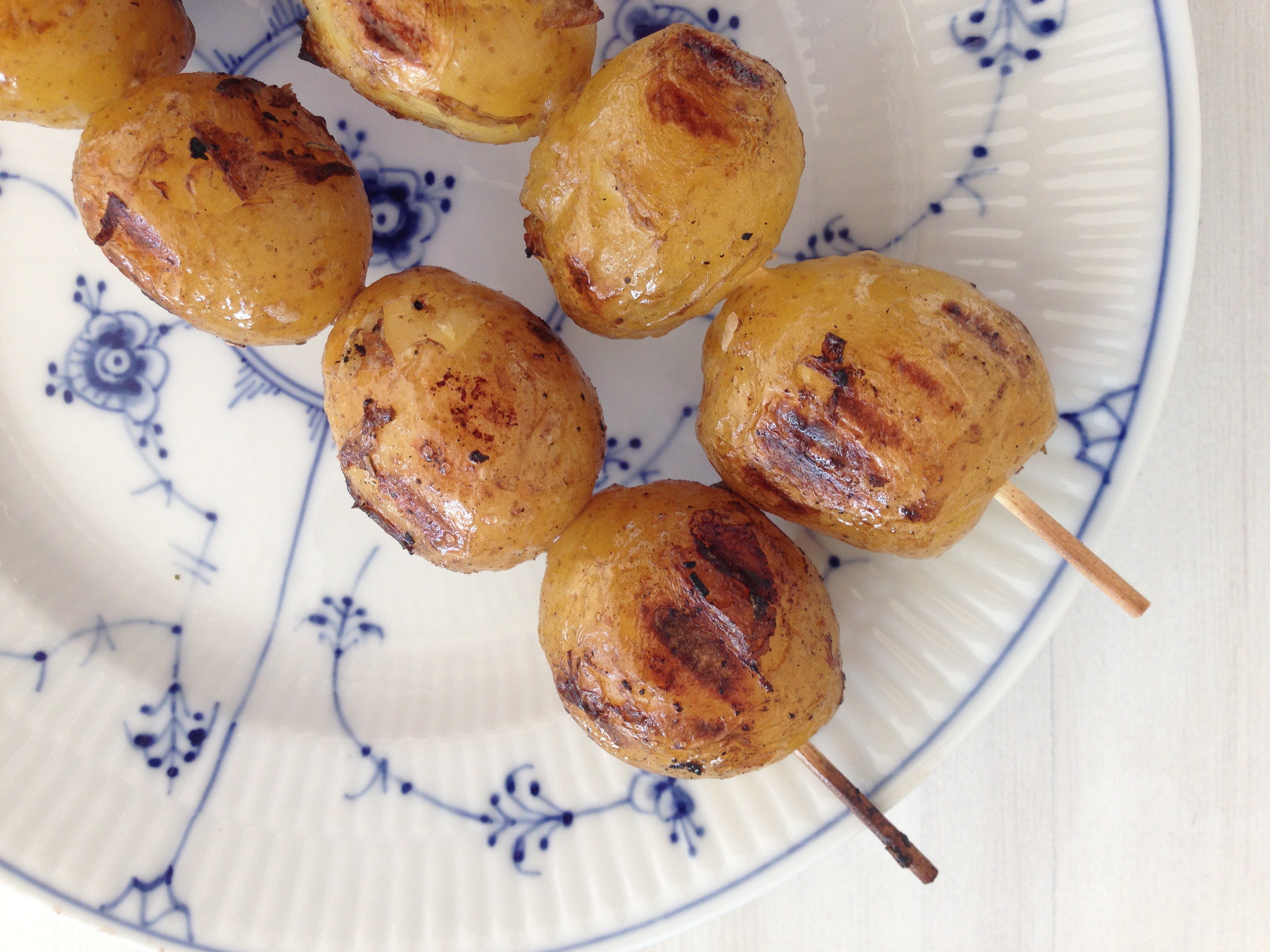 Vi griller rigtig meget i disse dage og et nyt hit i år her på matriklen er grillede kartofler på spyd.