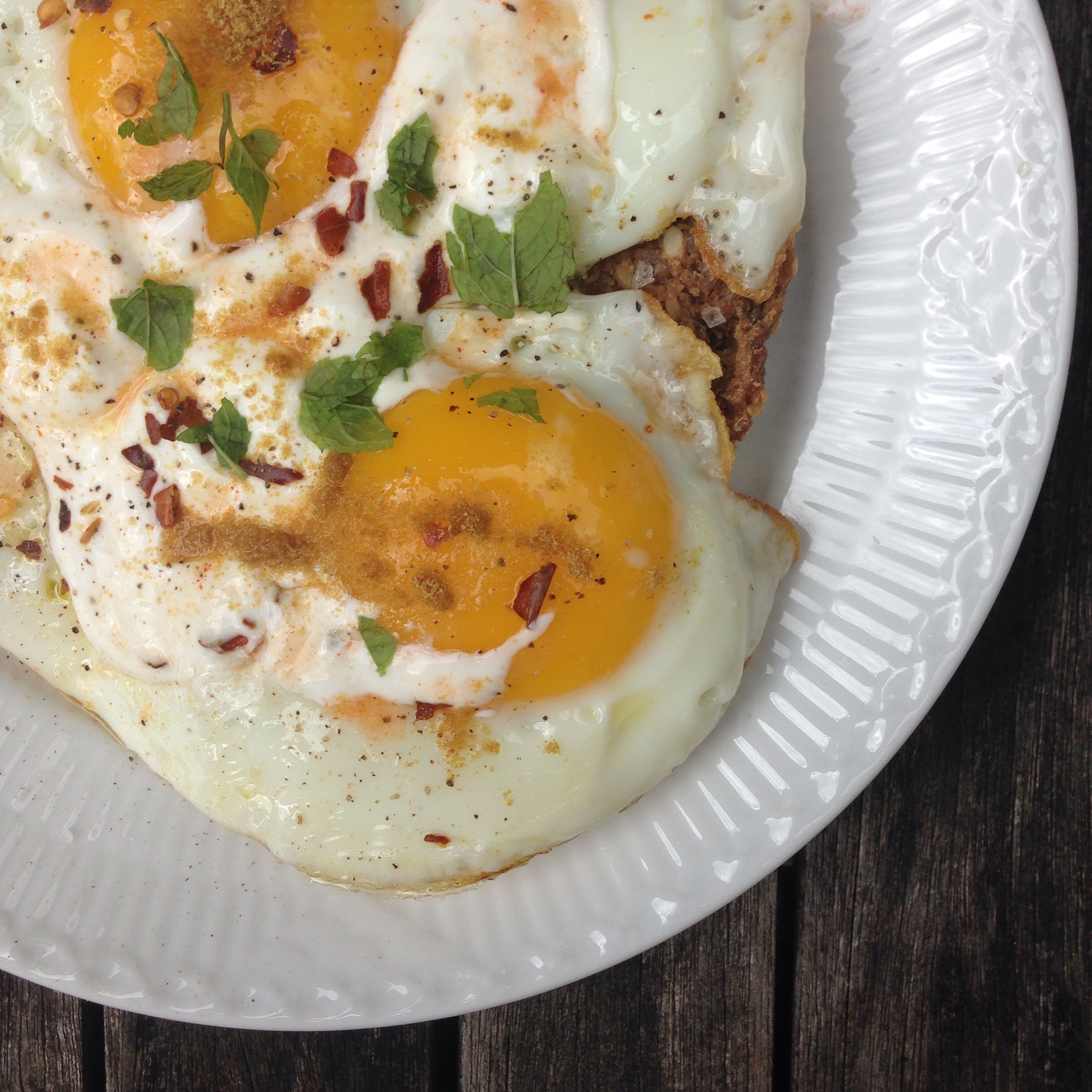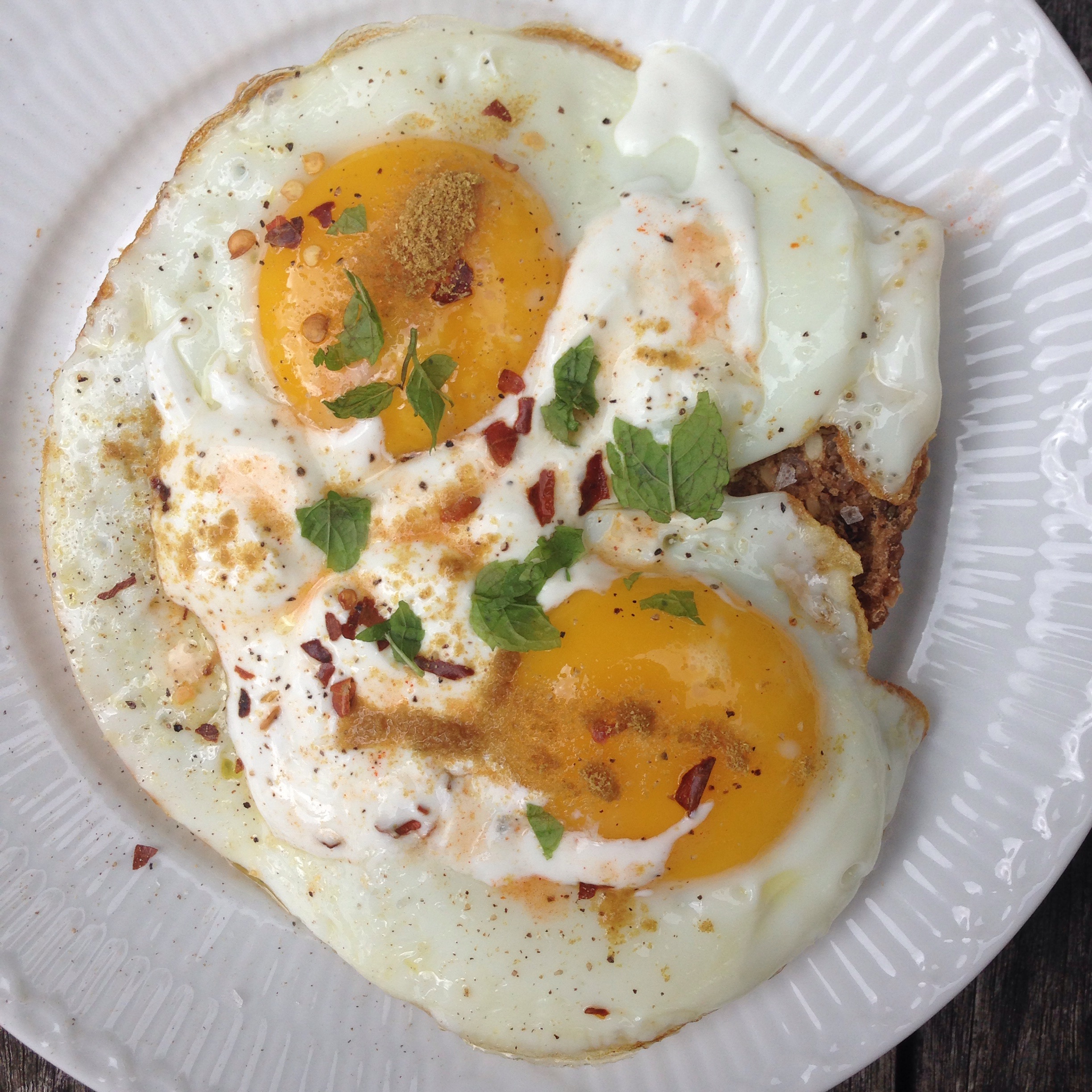 Retten i sig selv er super nem. 2 spejlæg drysses med lidt stødt koriander, chili, tabasco og mynte. Hvis man har lidt frisk koriander kan man også drysse det på.