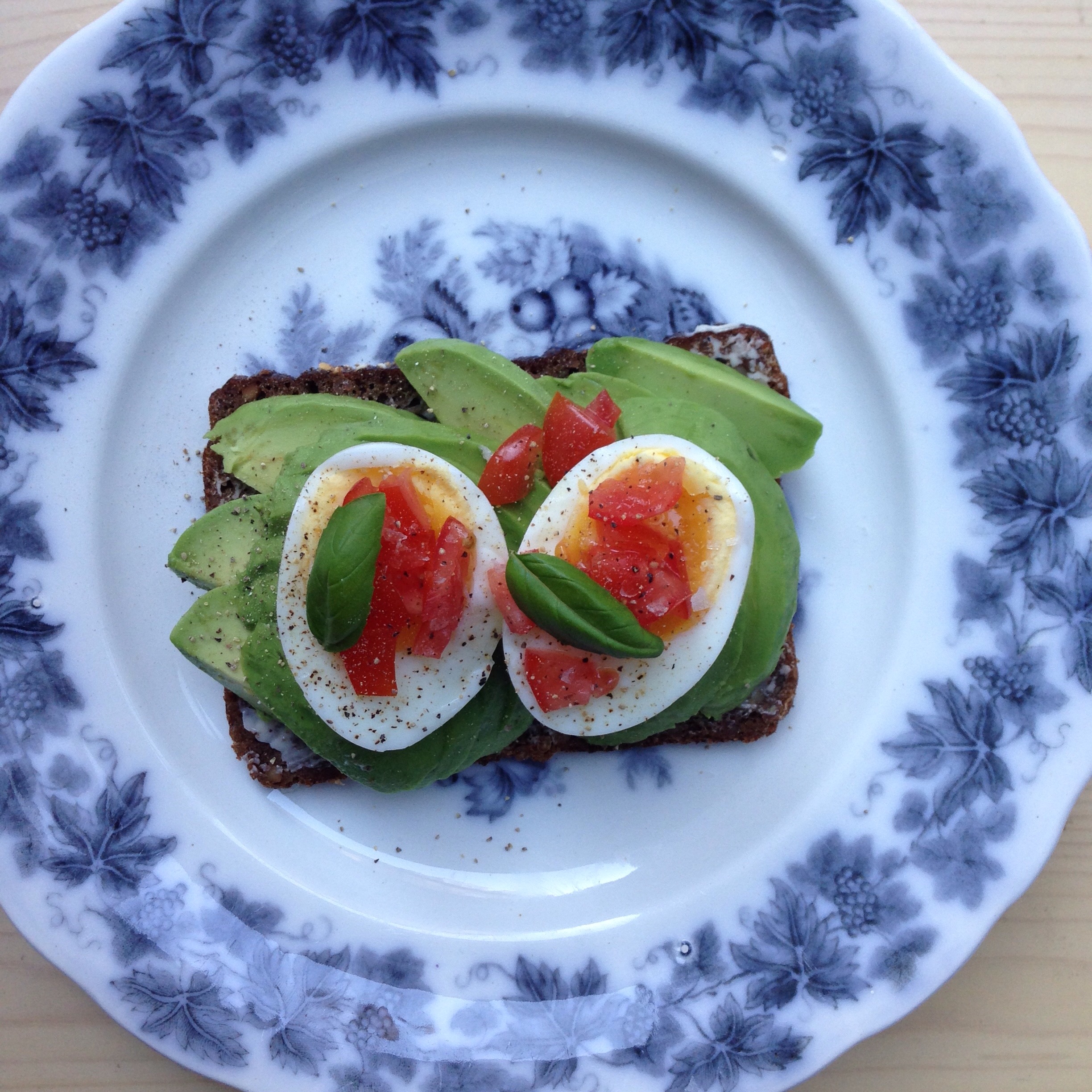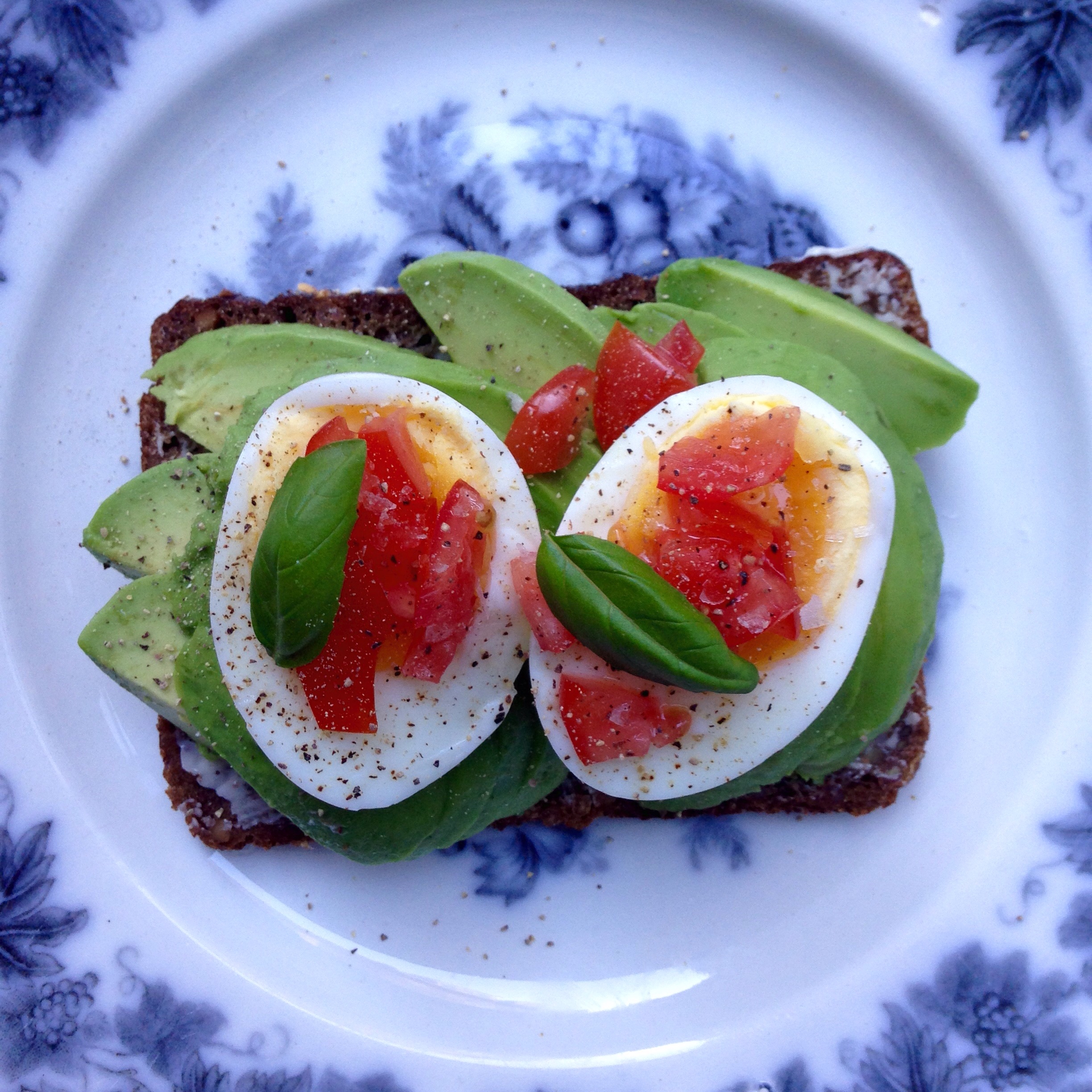 Moden avocado mast eller skåret i skiver, smilende æg og tomat på en skive rugbrød. Masser af salt og peber på toppen og en smule frisk basilikum.