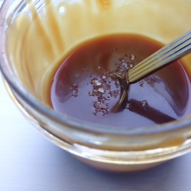 - Sluk for blusset når karamellen er kogt færdi og rør en smule saltflager i karamellen.