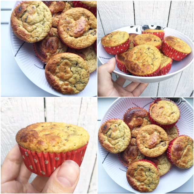 Bananpandekagemuffins med chokolade og brombær