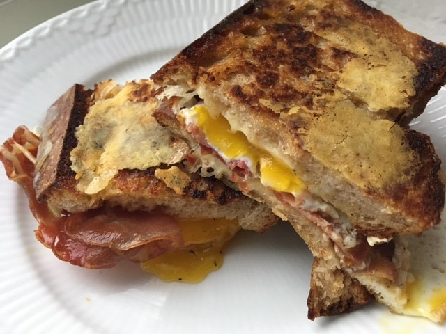Fried egg sandwich med ost og bacon