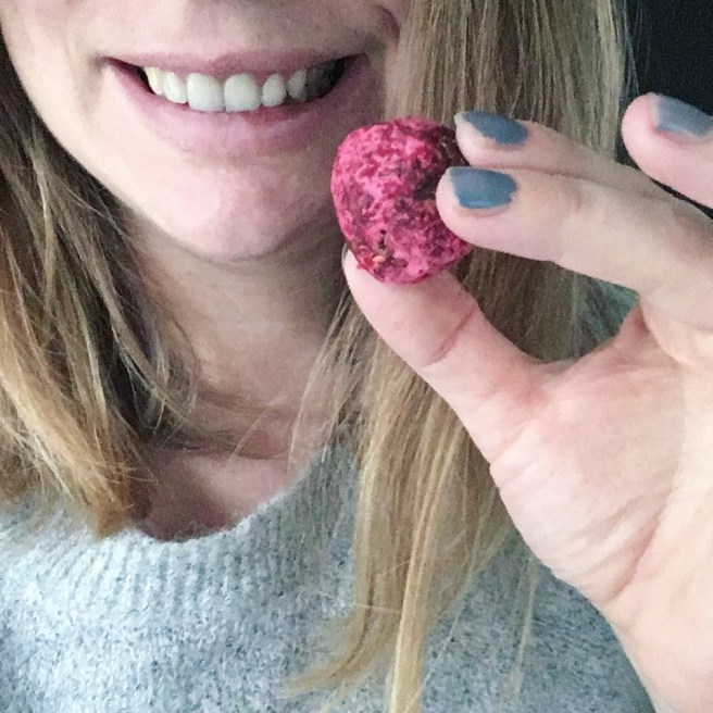 Havregrynskugler med revet marcipan og hindbærstøv – ca. 30 styks.