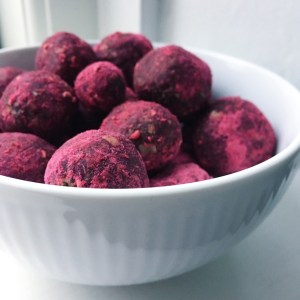 Havregrynskugler med revet marcipan og hindbærstøv