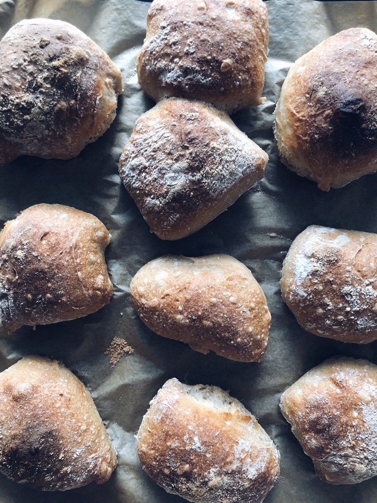 11. Bag bollerne i midten af ovnen i cirka 18-20 minutter. Hold øje med at bagepapir eller boller ikke bliver sorte. Så skruer du bare lidt ned for varmen. Det er vigtigst at de får høj varme de første 5 minutter hvor de ligesom ”popper” det er nemlig det som giver den sprøde skorpe.