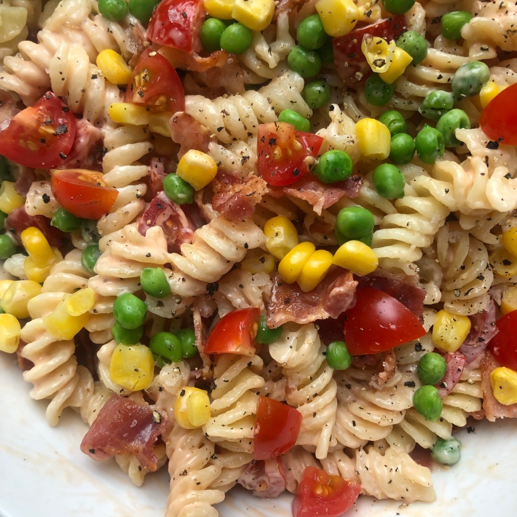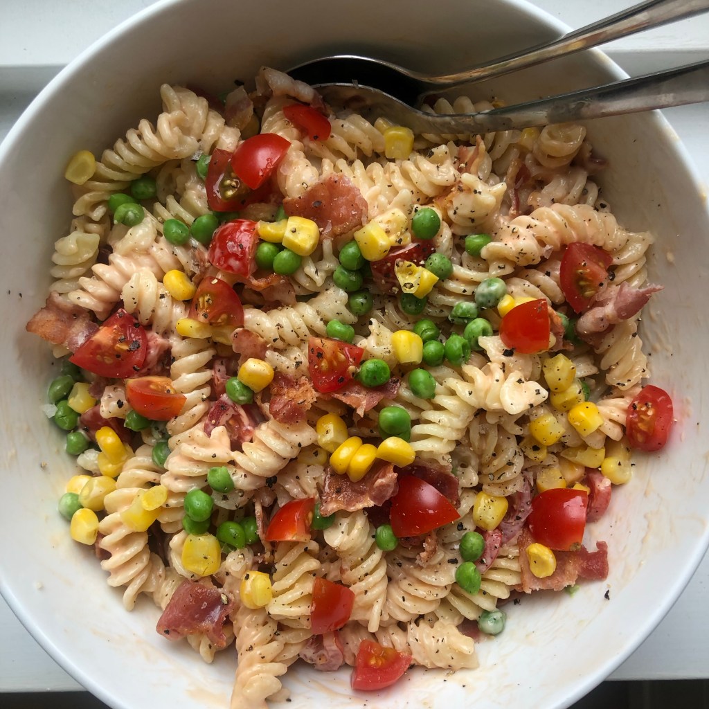 Her med majs, tomat, ærter og bacon men rucola, edamame bønner, agurk, peberfrugt eller cornichoner i små stykker er også lækkert. Man kan også tilsætte feta eller salatost hvis man er til det. Kun fantasien sætter grænser.