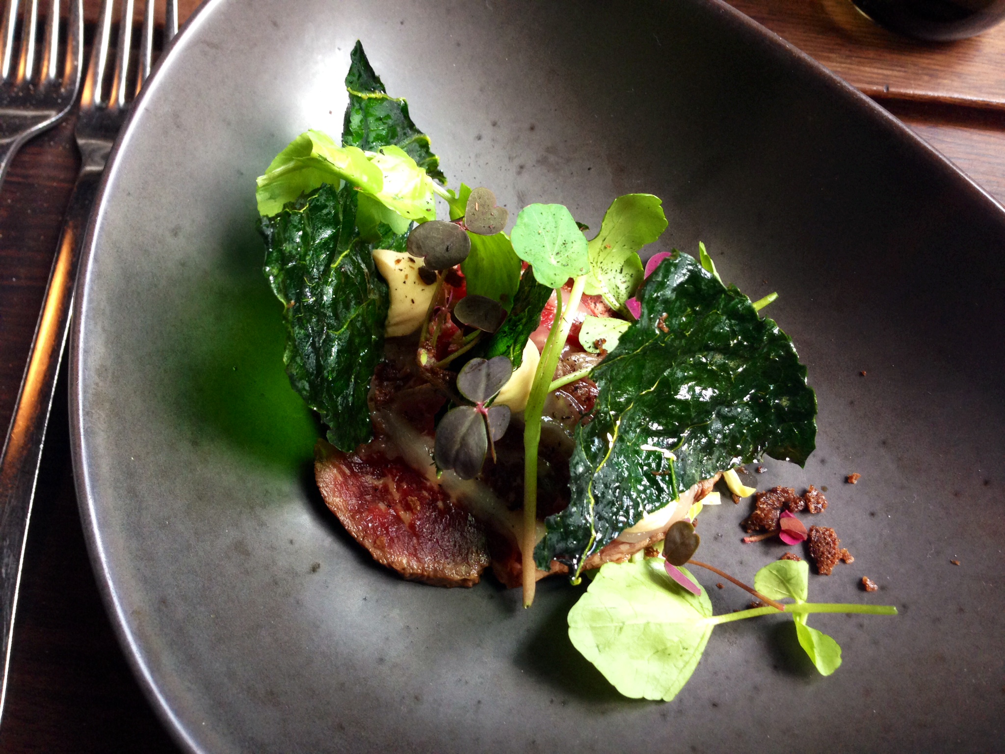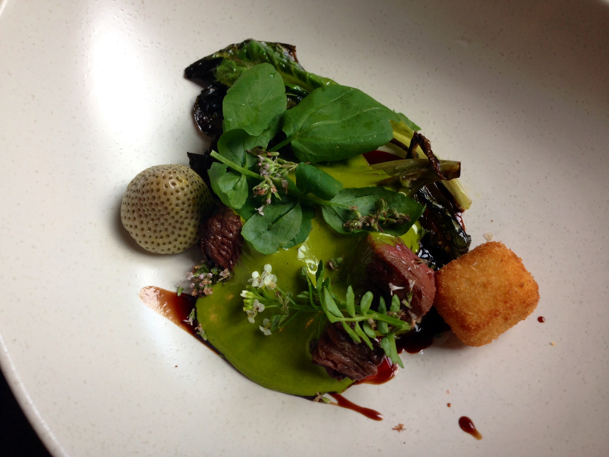 Stegt oksehøjreb med sprød kartoffel, stegt salat, røget marv og luftig ramsløg