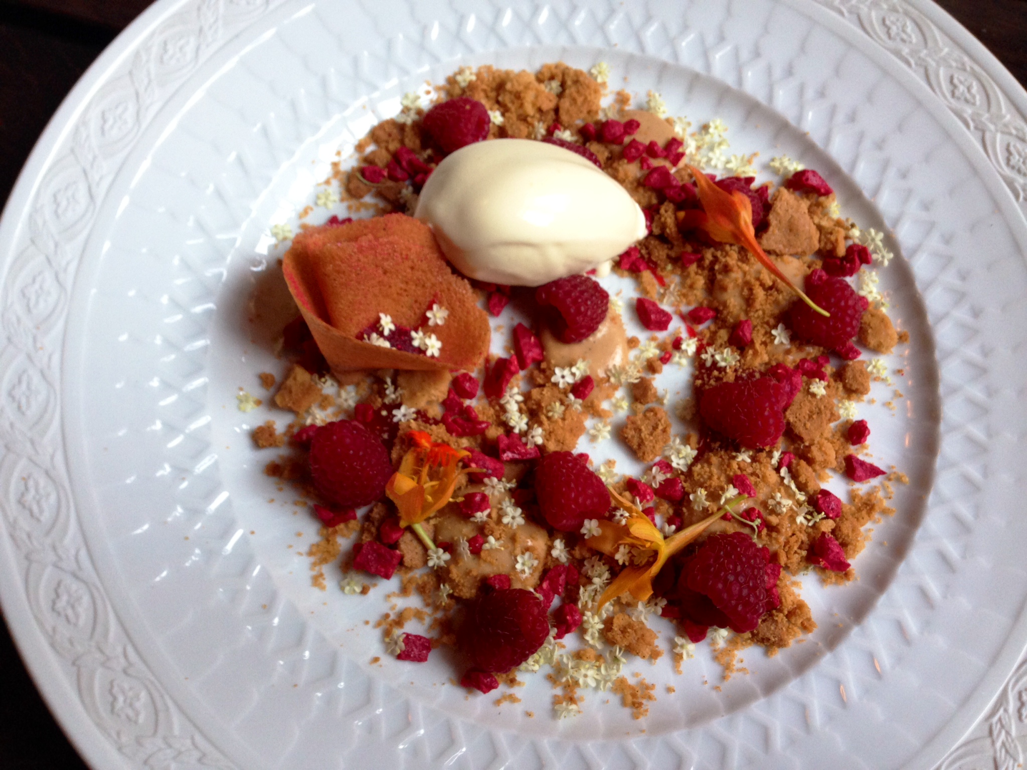 Hindbær med sprød sablé, frossen hyldeblomst og ristet vanillecreme