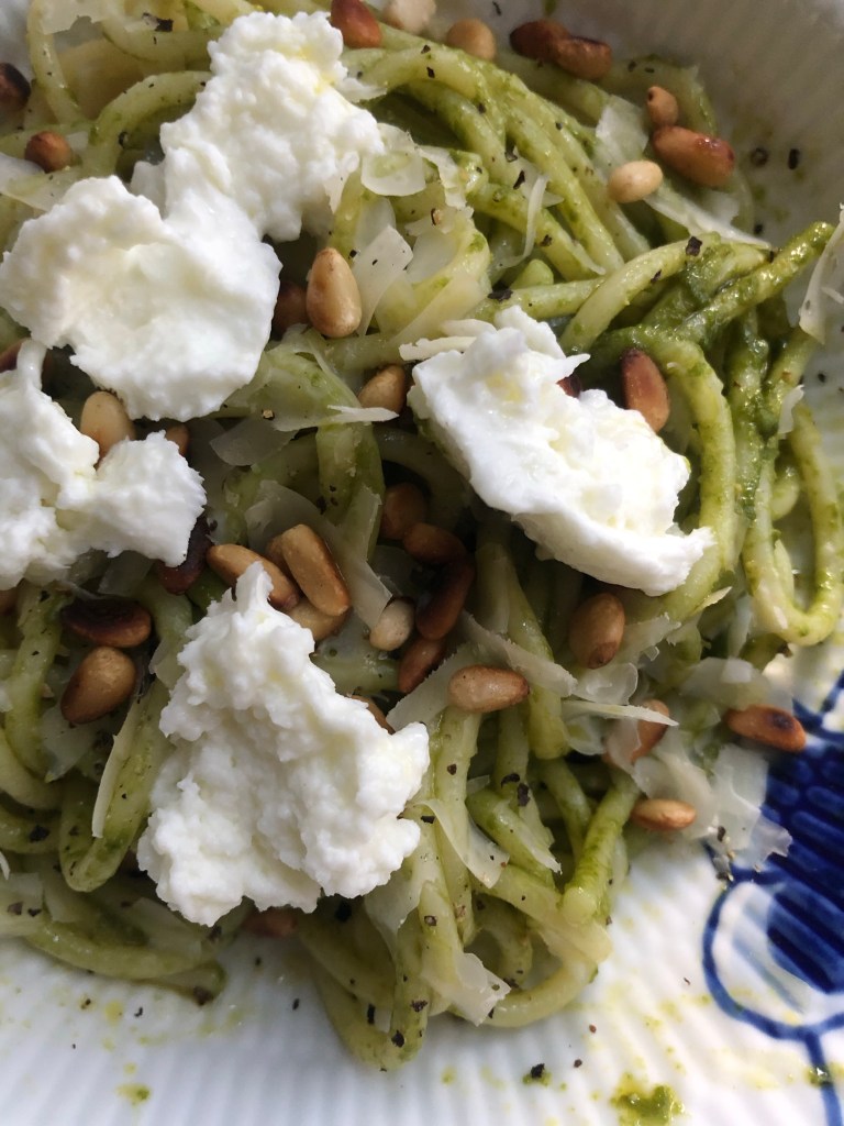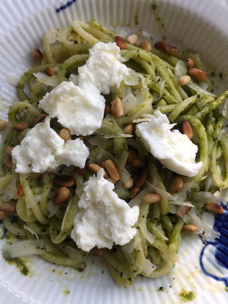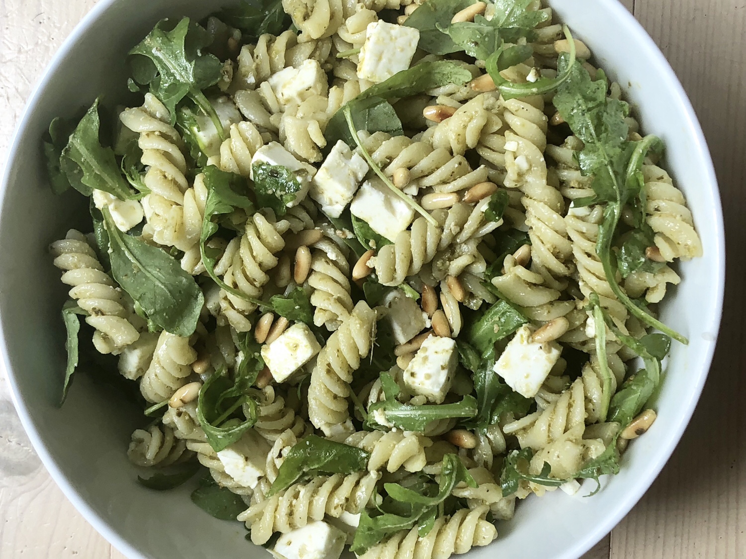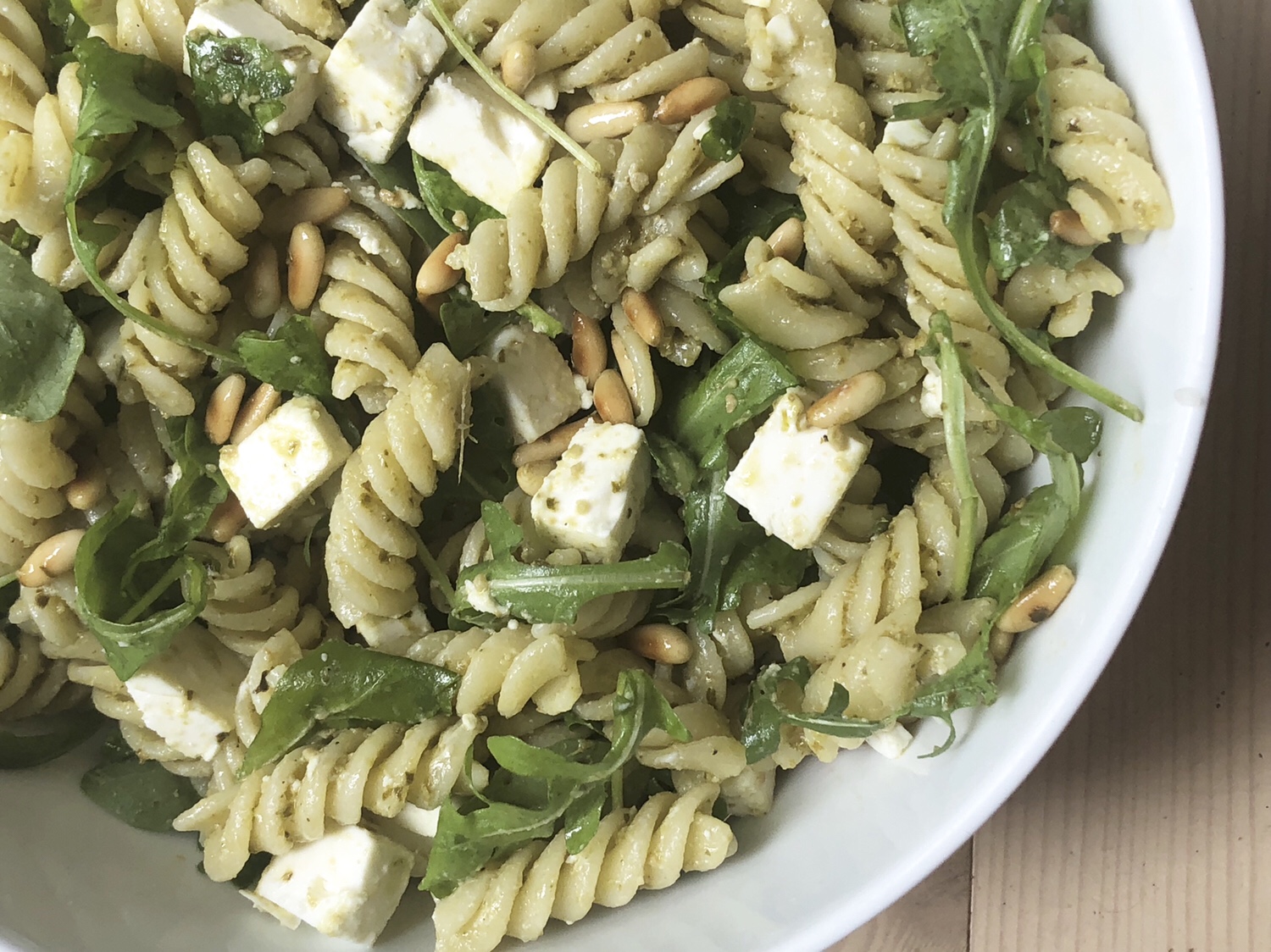 En grøn pastasalat som passer rigtig godt til det meste.