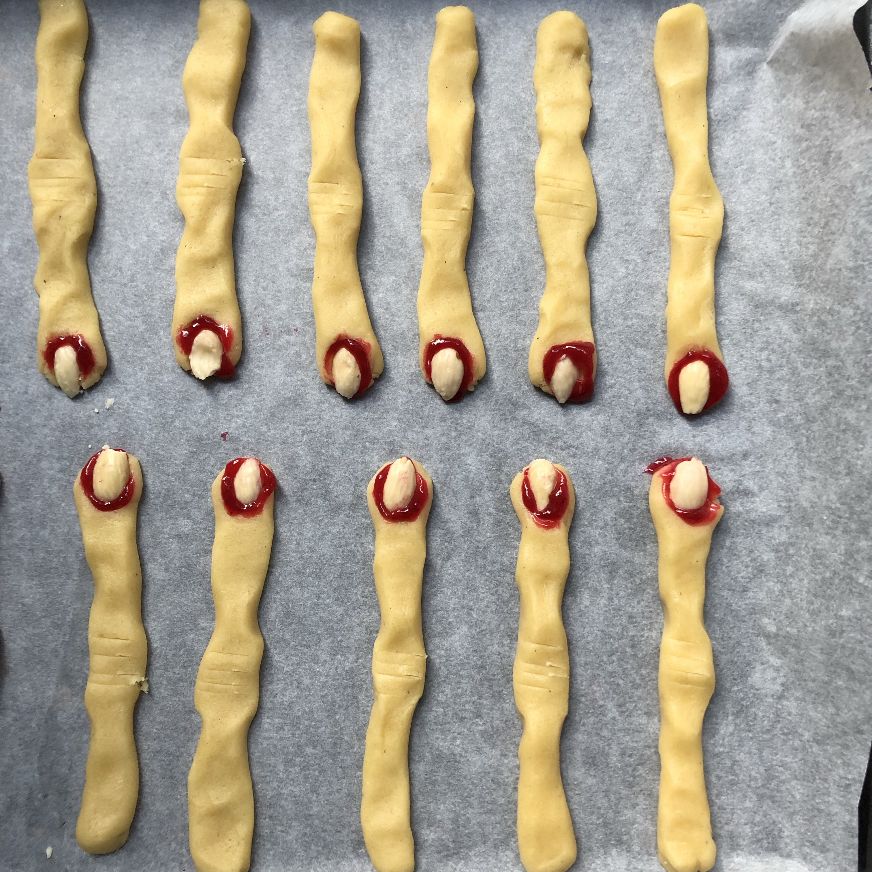 - Tag den meget varme bageplade ud og læg et stykke bagepapir på.