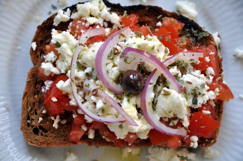 Start med at riste brødet så det tager godt med farve. Skær herefter tomaterne i små tern og læg dem ovenpå brødet. Smuldr fetaen over brød og tomat og skær tynde ringe af rødløget som anrettes oven på fetaen. Giv en godt sjat olivenolie og drys med frisk oregano og spidskommen. Sæt en oliven på toppen og voilá.