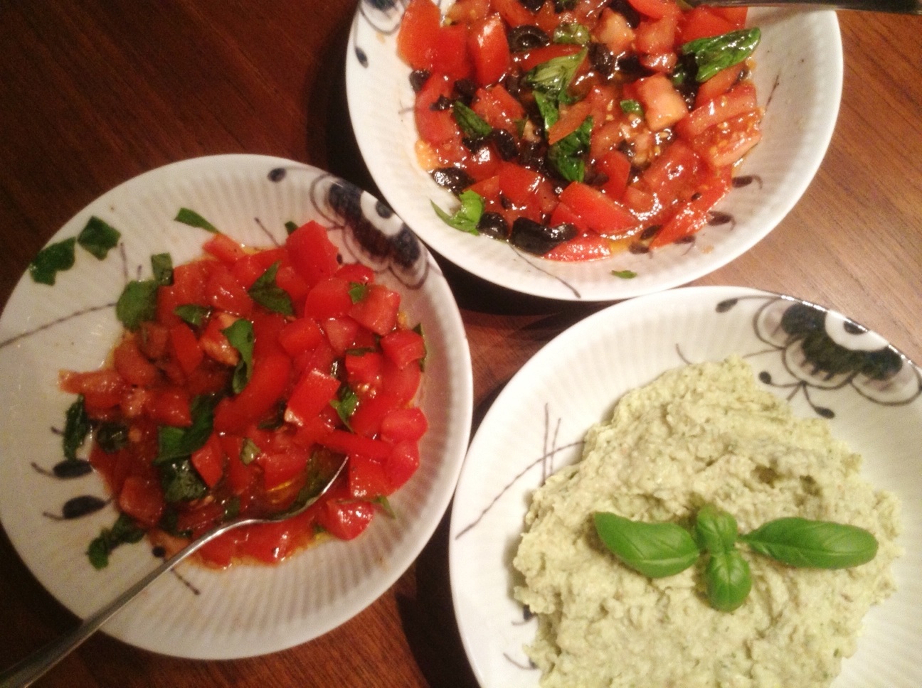 Den første bruschetta er en ganske almindelig tomat og basilikum bruschetta som laves ved at hakke 500 gram tomater fint og blande dem med en håndfuld hakket basilikum. Tilsæt 1-2 spsk. god olivenolie og smag til med salt og peber.