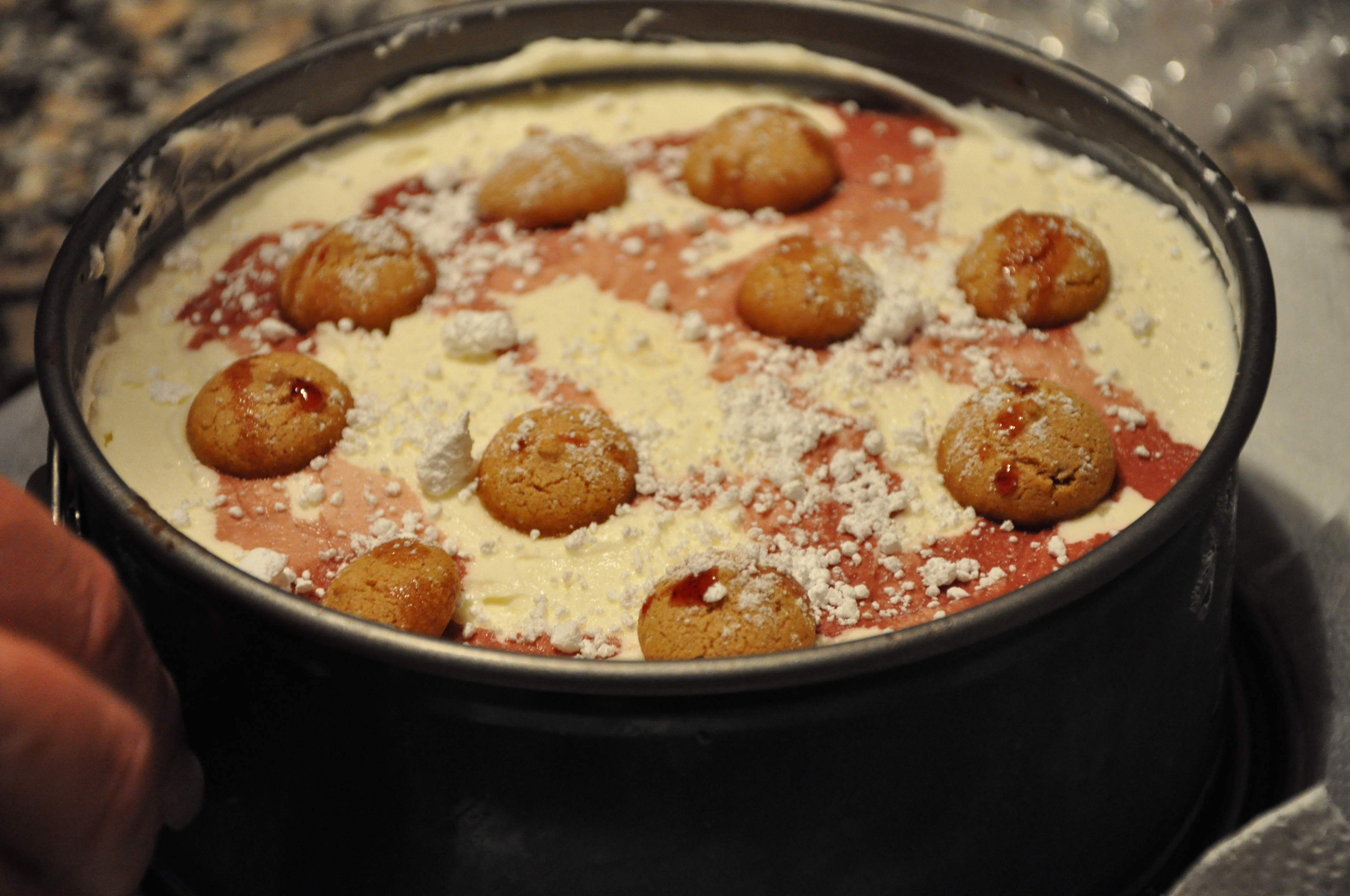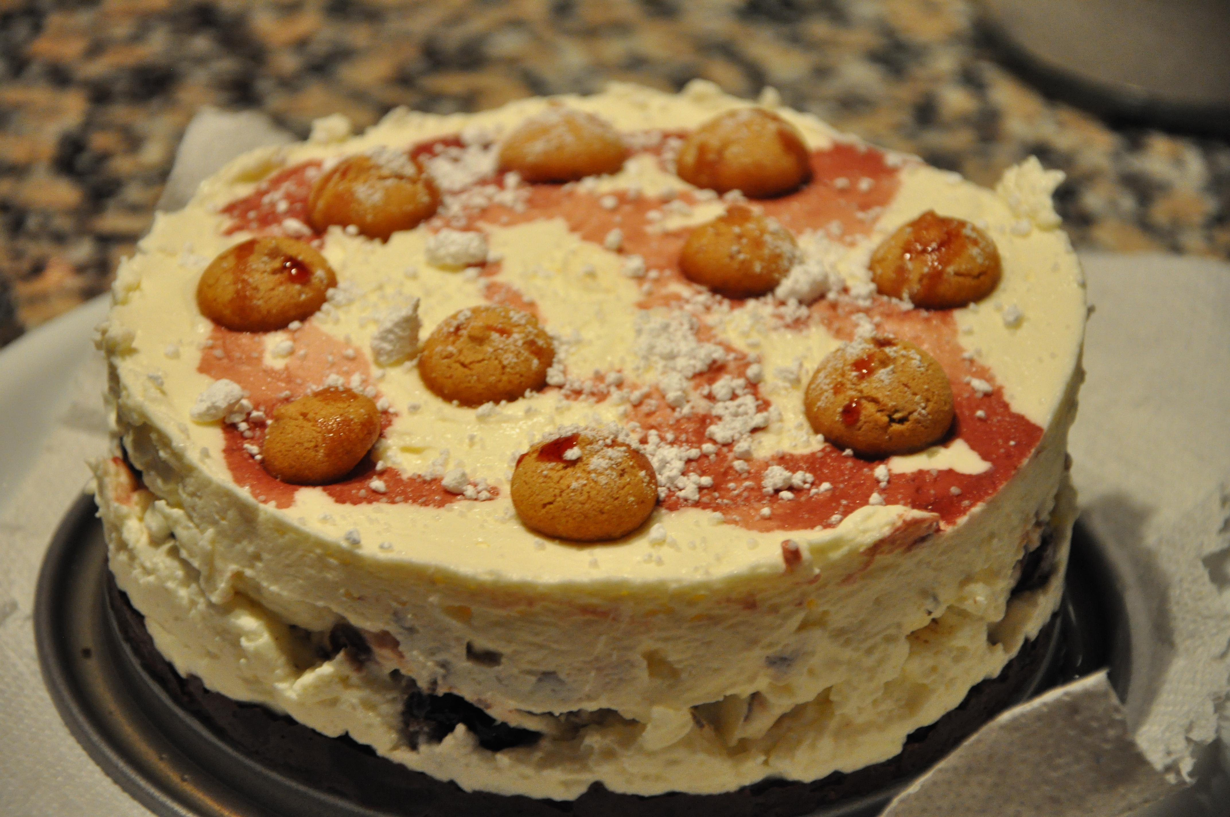 Smelt de sidste 25 g chokolade over vandbad og hæld det i resten af cremen. Rør forsigtig rundt med en ske og hæld nu resten af cremen med chokolade mønster over kirsebærrene. Stil tærten på køl i minimum 4 timer og server med hele Amarettini + drys af flormelis og måske lidt kirsebær sauce på toppen.
