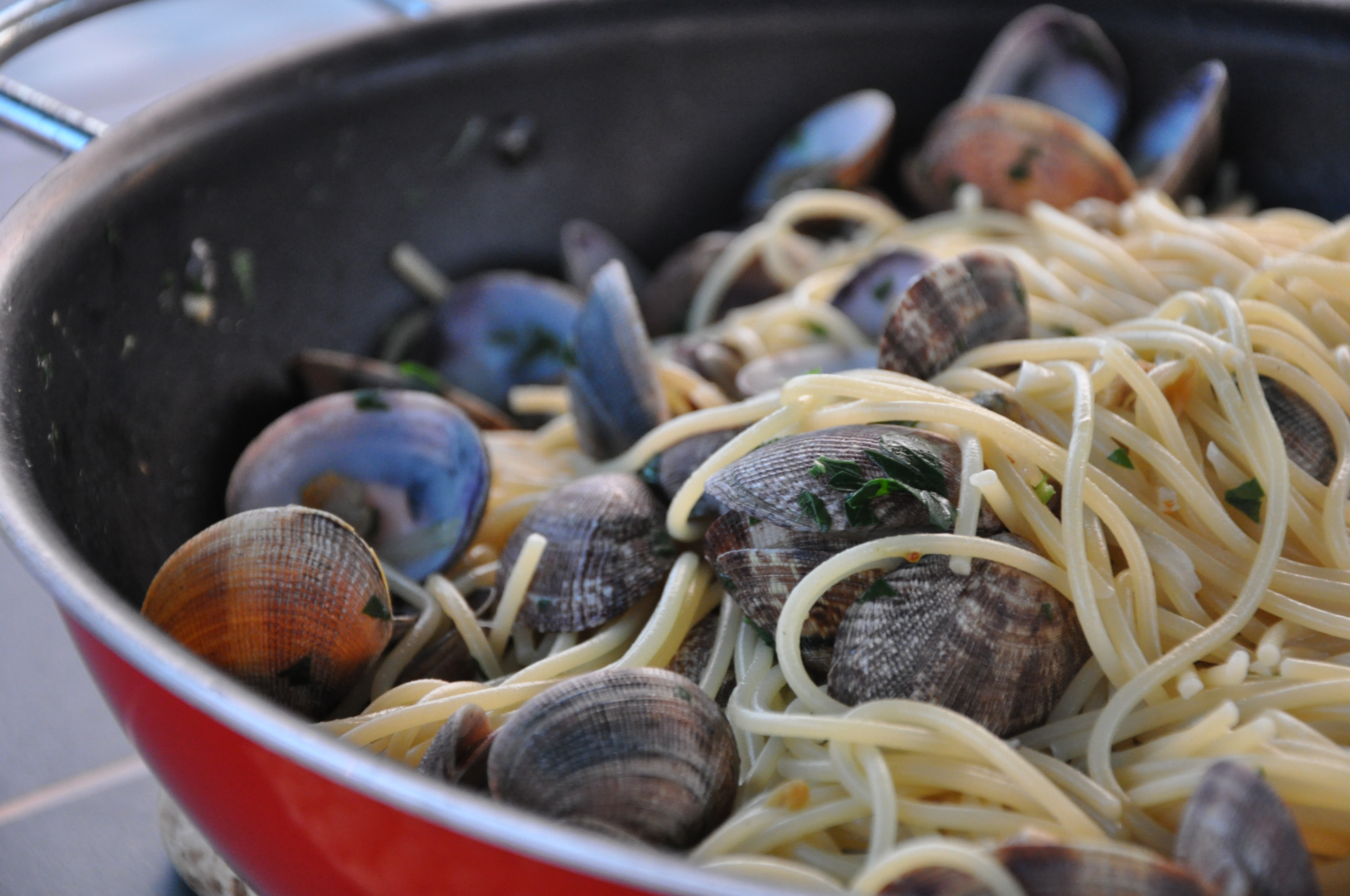 Hæld nu muslingerne og de andre brunede skaldyr sammen med den kogte spaghetti og tilsæt eventuelt en smule af det kogte spaghetti vand hvis vin og fond har kogt for meget ind. Krydr med salt + friskkværnet peber og måske lidt ekstra hakket bredbladet persille på toppen. Server med det samme ♥